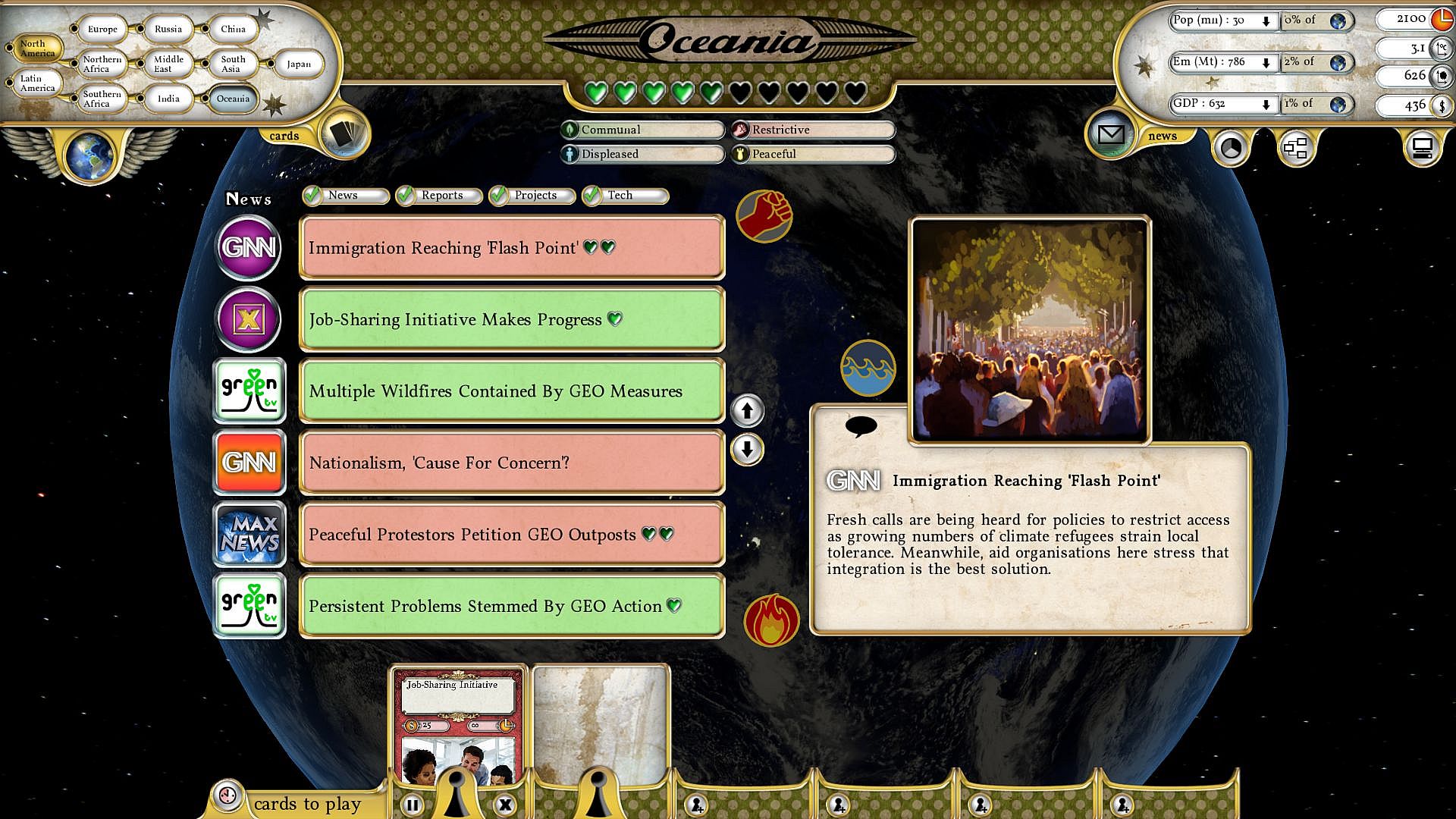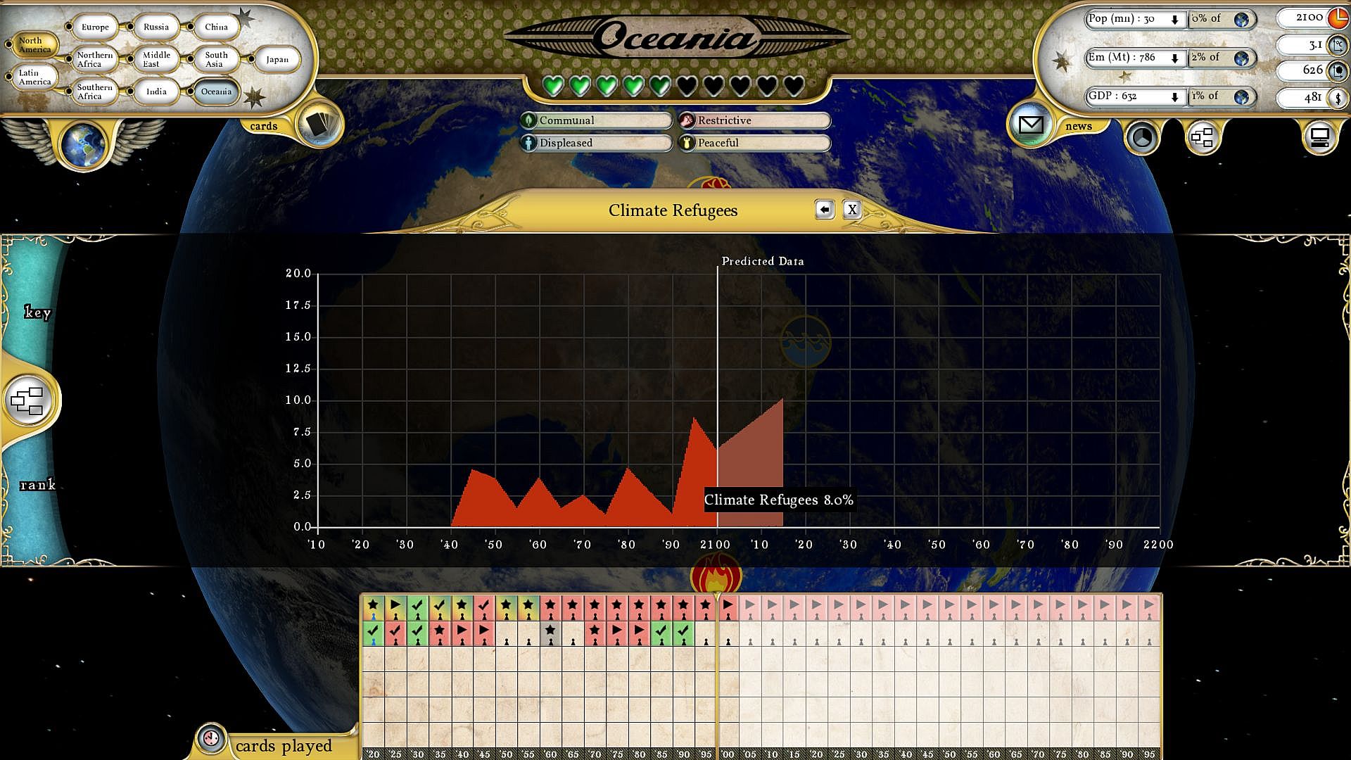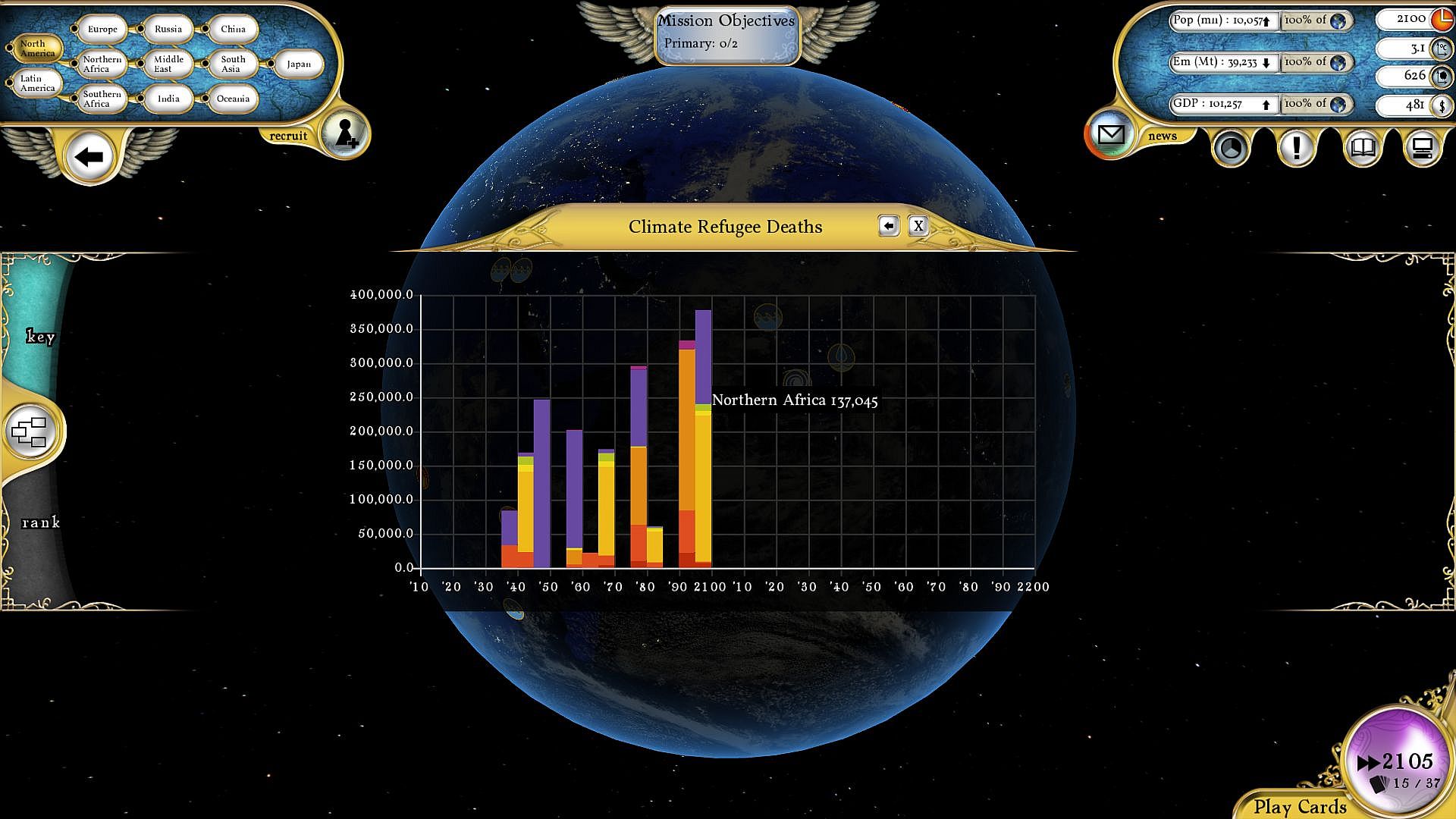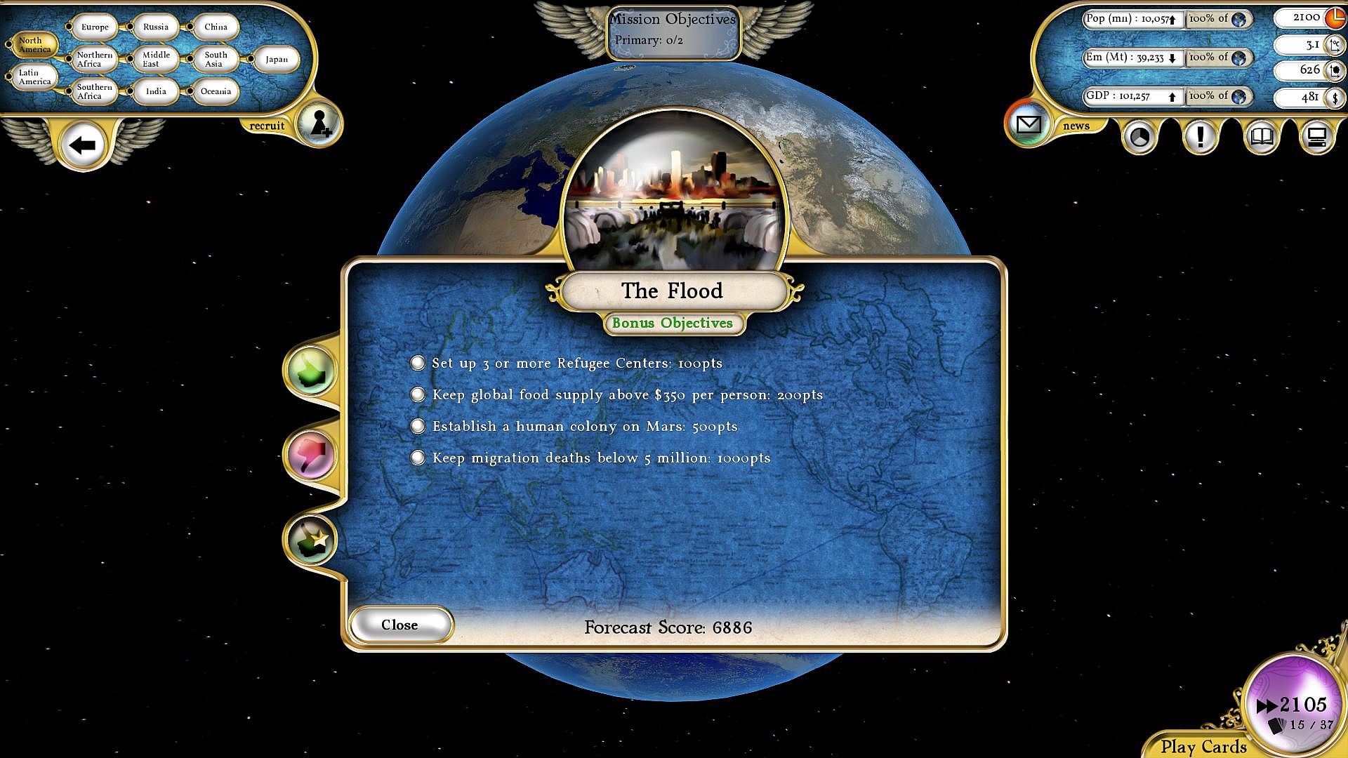 New Mission: The Flood is an all-new, self-contained mission that focuses on the human impact of climate change in the next century. In The Flood, you take up the reins of the Global Environmental Organization 80 years after its inception...and your predecessor left a mess. The seas may be rising, and the deserts spreading but the biggest crisis facing Earth is the urgent threat of millions of people forced to flee their homes and countries. Where will these climate refugees go? Relax and tighten borders, curb or encourage emigration and integrate new settlers quickly, or you'll have no choice but to take drastic measures. Whatever you choose, step carefully, or the cost in human life will be unheard of.