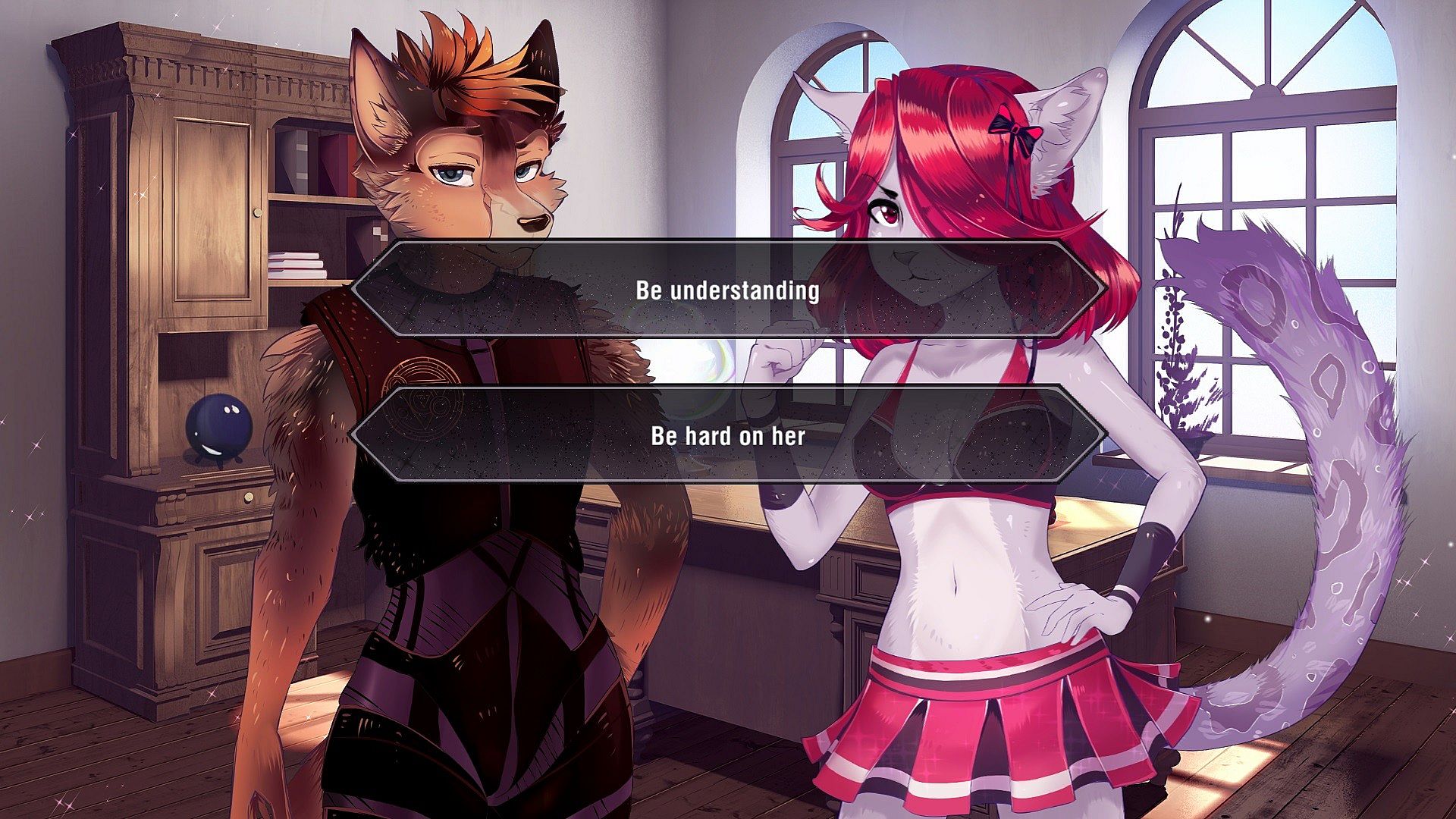 This game is an animated romantic dating simulator in the furry style.