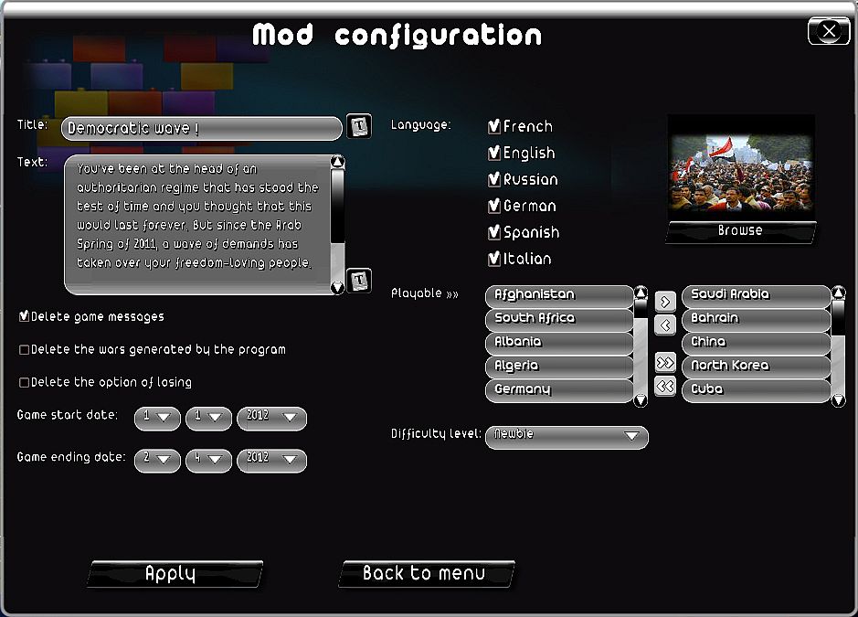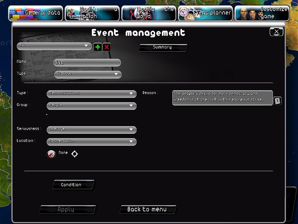 ● create new missions and scenarios that are highly developed and detailed (triggering protests, wars, disasters, political scandals, assassinations, national elections, character demands... with the option of defining several conditions for triggering these events, and editing game text...)