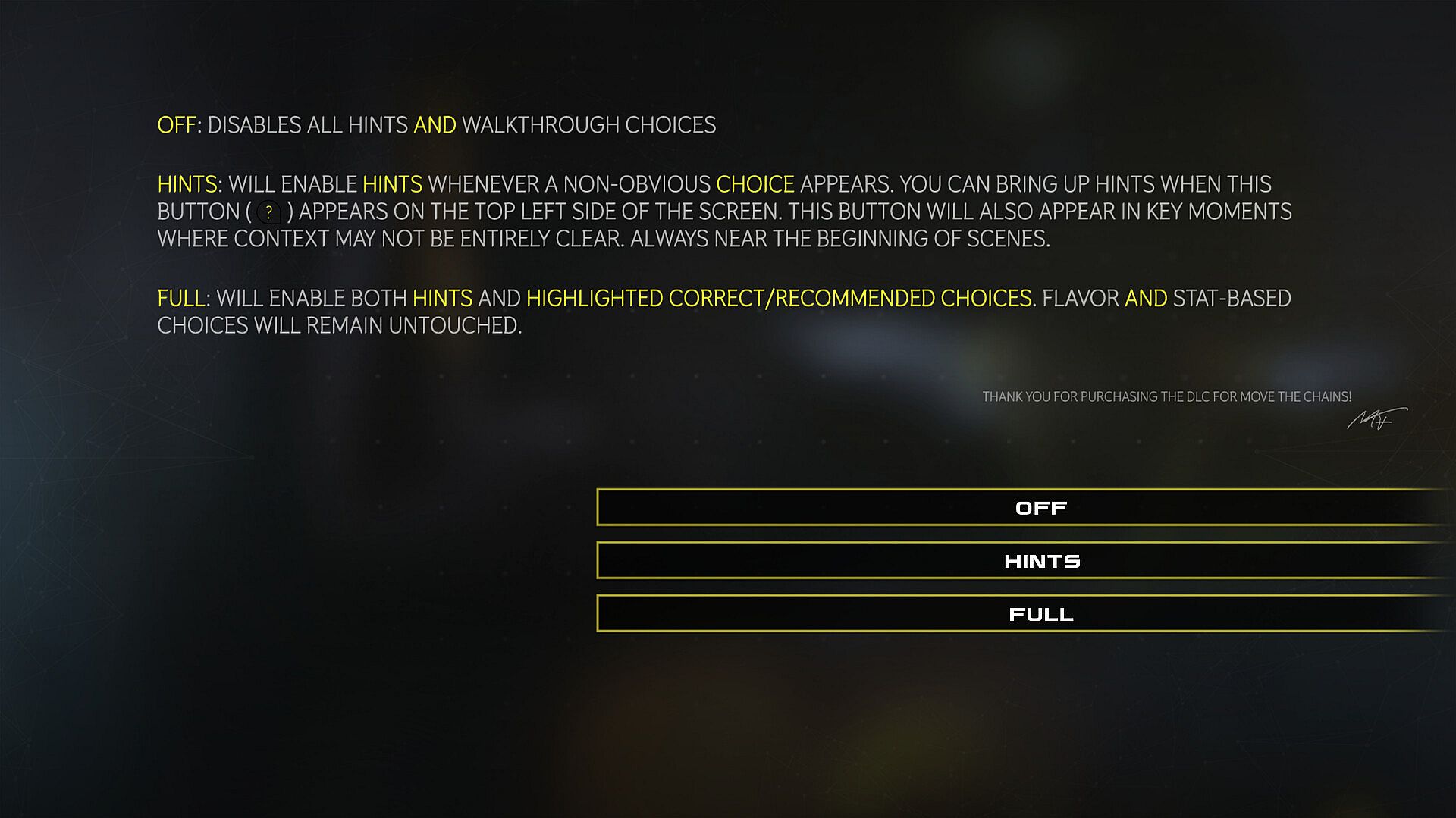 The in-game walkthrough features two modes: a "Hint" mode and a "Full" mode that'll include both the hints and the "correct" highlighted choice. In the "Hint" mode, you'll see a question mark inside of a bubble. You'll come across some "N/A" parts where I felt the hints weren't super necessary. For "Full", you'll see the question mark/bubble and the highlighted choice. The choice is up to you, of course.