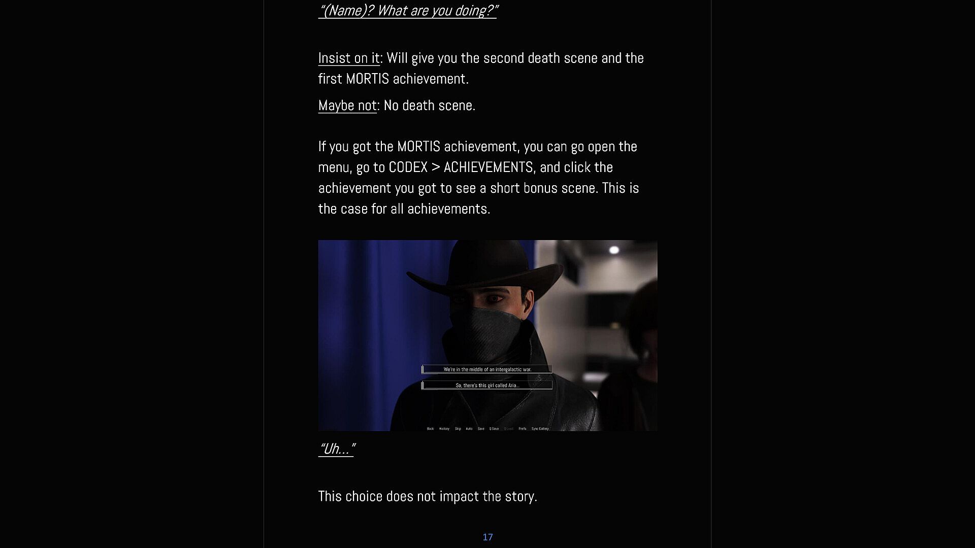 The guide will go through each part of the story and explain each choice and what impact it might have. At the end there is also a summarized section of all scenes, achievements, and lore entries, briefly explaining how to unlock them all.