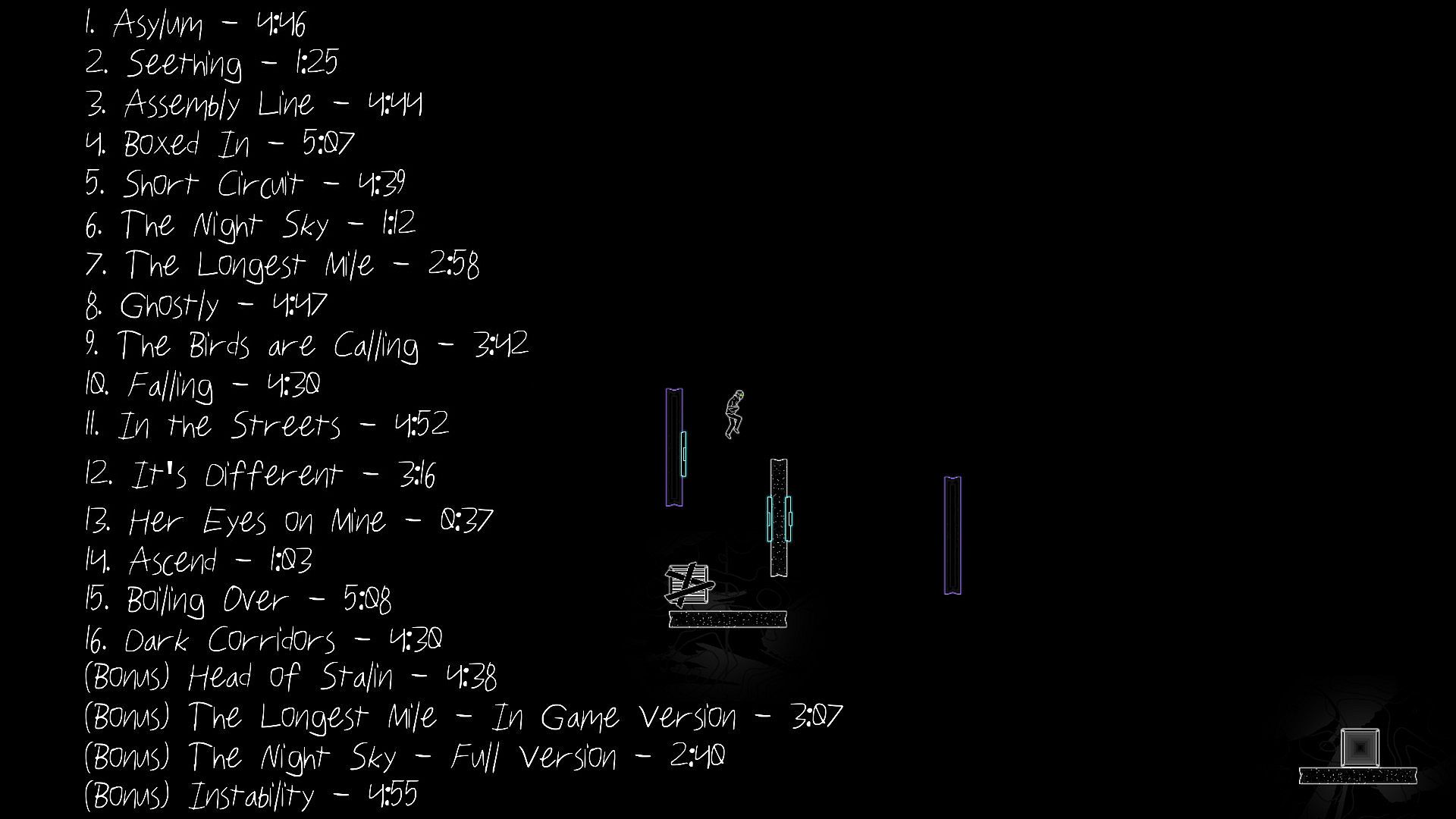 Grab the full 20-track soundtrack from Bean Boy Games' Turner on PC. It delivers high-quality renditions of every song from the game, crafted by Kevin Thomas. Tracks span intense moods like "Asylum" at 4:46 and "Seething" at 1:25, up to atmospheric pieces such as "The Night Sky" at 1:12. This indie collection captures the essence of Turner's audio world through titles evoking confinement, tension, and mystery. Listeners hear "Assembly Line" run 4:44 and "Ghostly" stretch to 4:47. Fans of the game's sound design find a complete companion here.