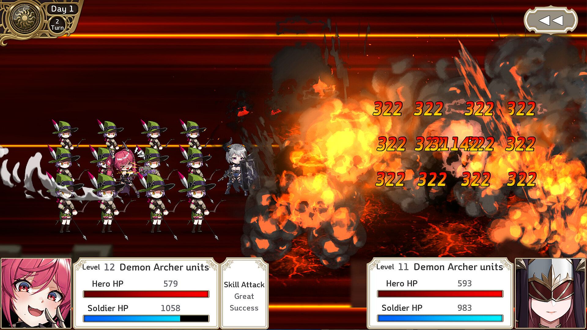 It is turn-based. Random weather changes, the day and night, terrain kind and combination between the hero and the soldier affect outcome of each battle.