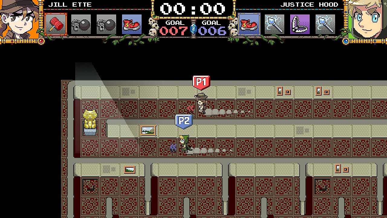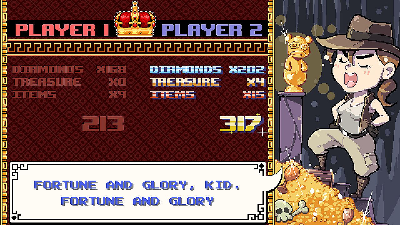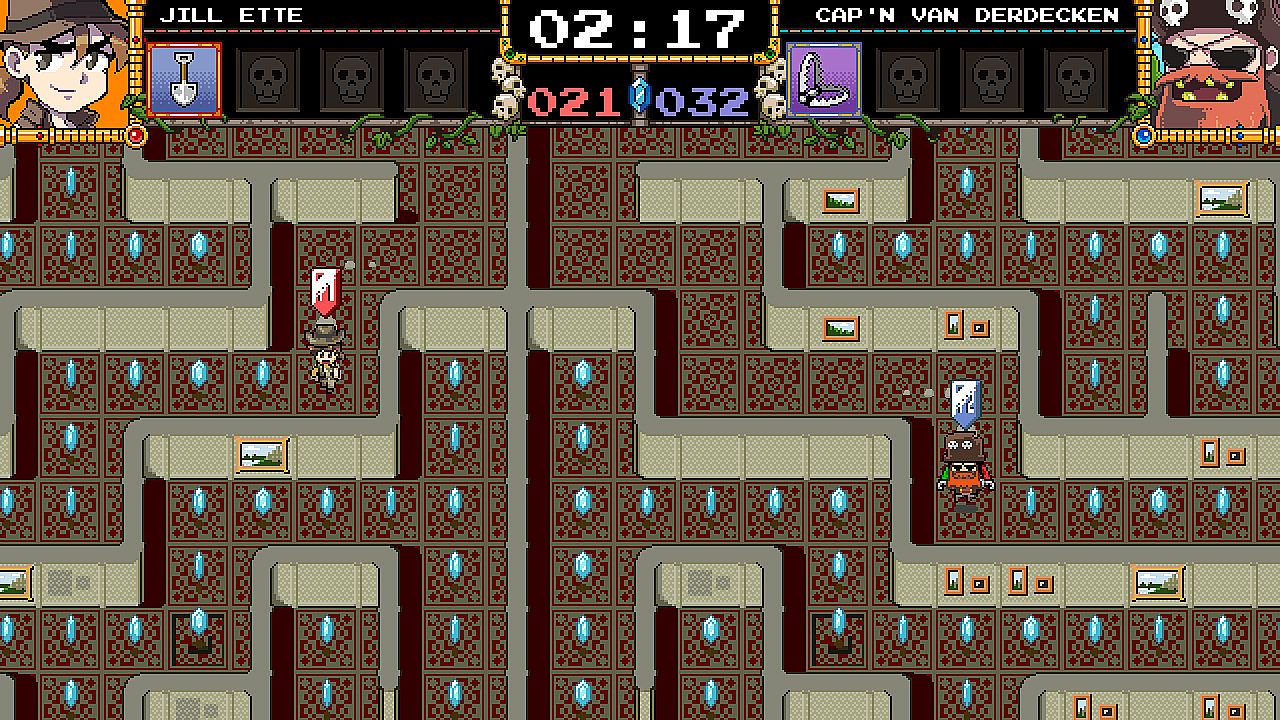 Two players compete head-to-head in intense local multiplayer arcade action, racing to grab the most diamonds before time runs out. Collecting gems uncovers buried items that unleash attacks on rivals or deliver short-lived speed advantages to pull ahead. Matches play out across four distinct worlds with seven characters, including four originals and three guests from other indie games. Custom settings in normal mode let players tweak rules and speed for varied showdowns. An extra "Race for the Idol" mode challenges duos to dash through a maze and seize the golden statue first. This indie gem suits fans of quick, fierce 2-player rivalries on PC.