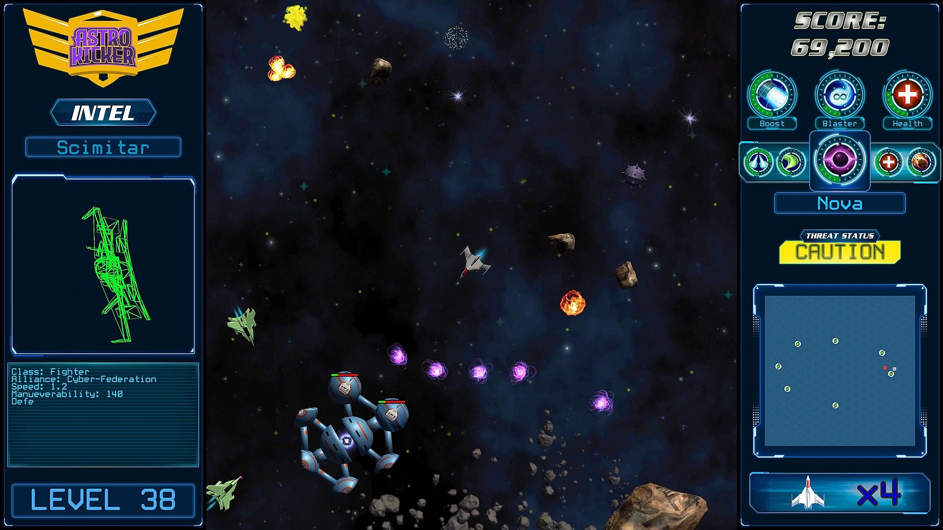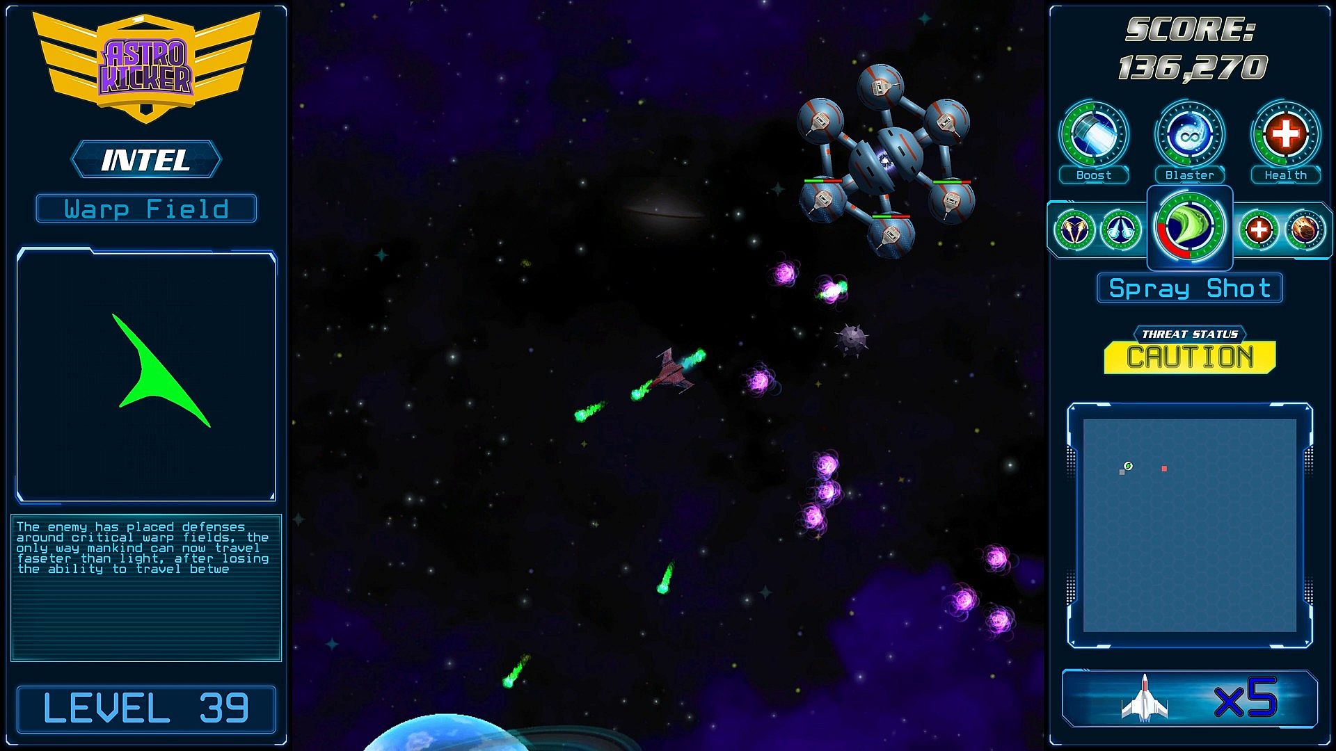 Mixing old and new, Astrokicker is inspired by classic shootemups going back to the 80s, with a few twists. Pilot your ship in any direction, avoiding asteroids and steering well clear of space mines, as you use a variety of weapons and power ups to destroy the starbases controlling warpfields used to travel between the stars.