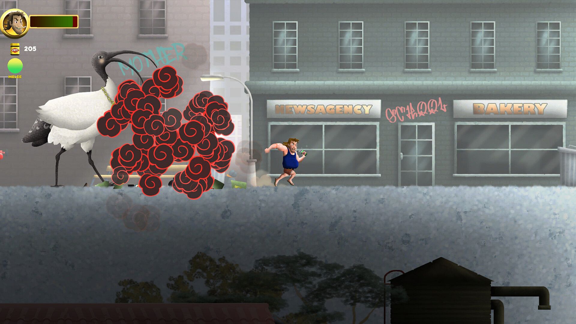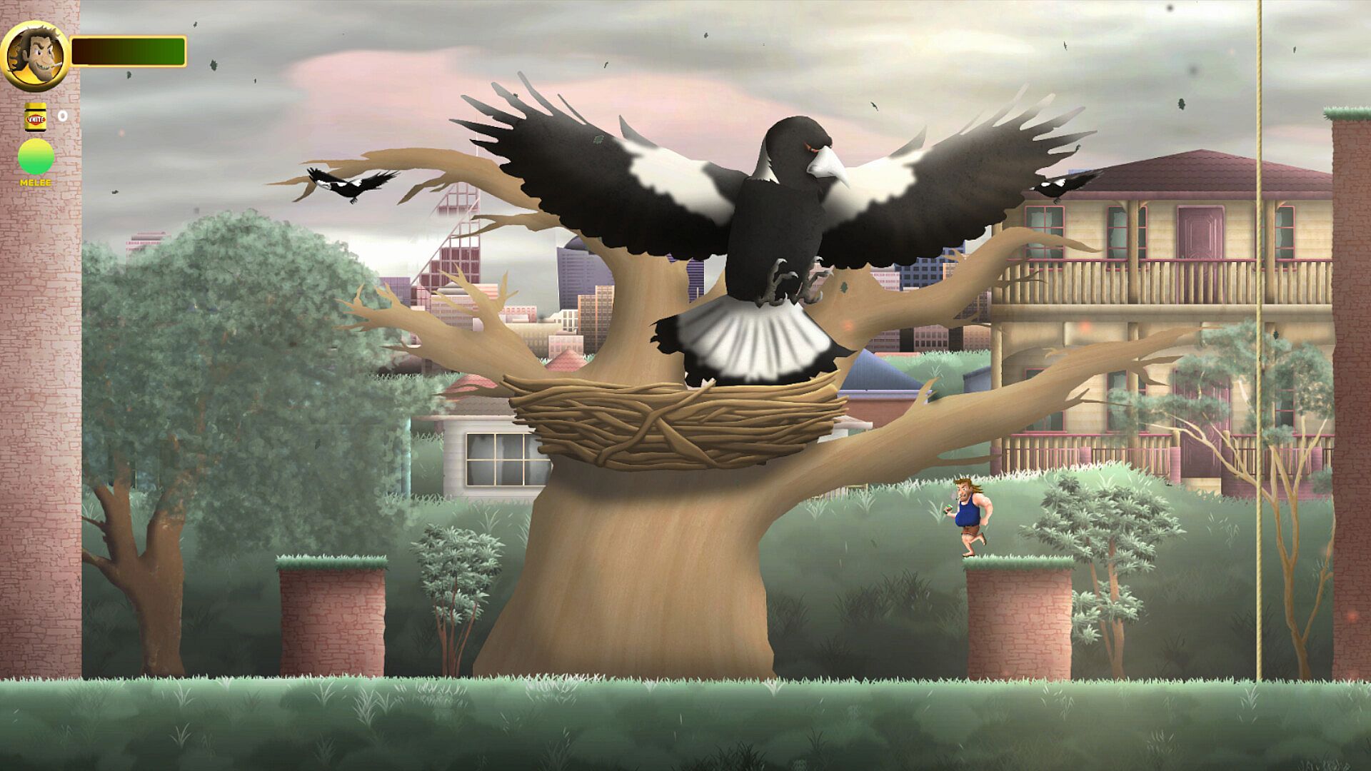 Menacing magpies. Bulbous bin chickens. Ravenous redbacks. The outback’s crawling with trouble, and Davo’s not afraid to throw down. Arm yourself with whatever’s lying around—cricket bats, pub darts, or even your trusty ligher.