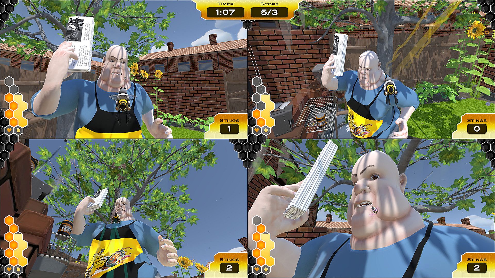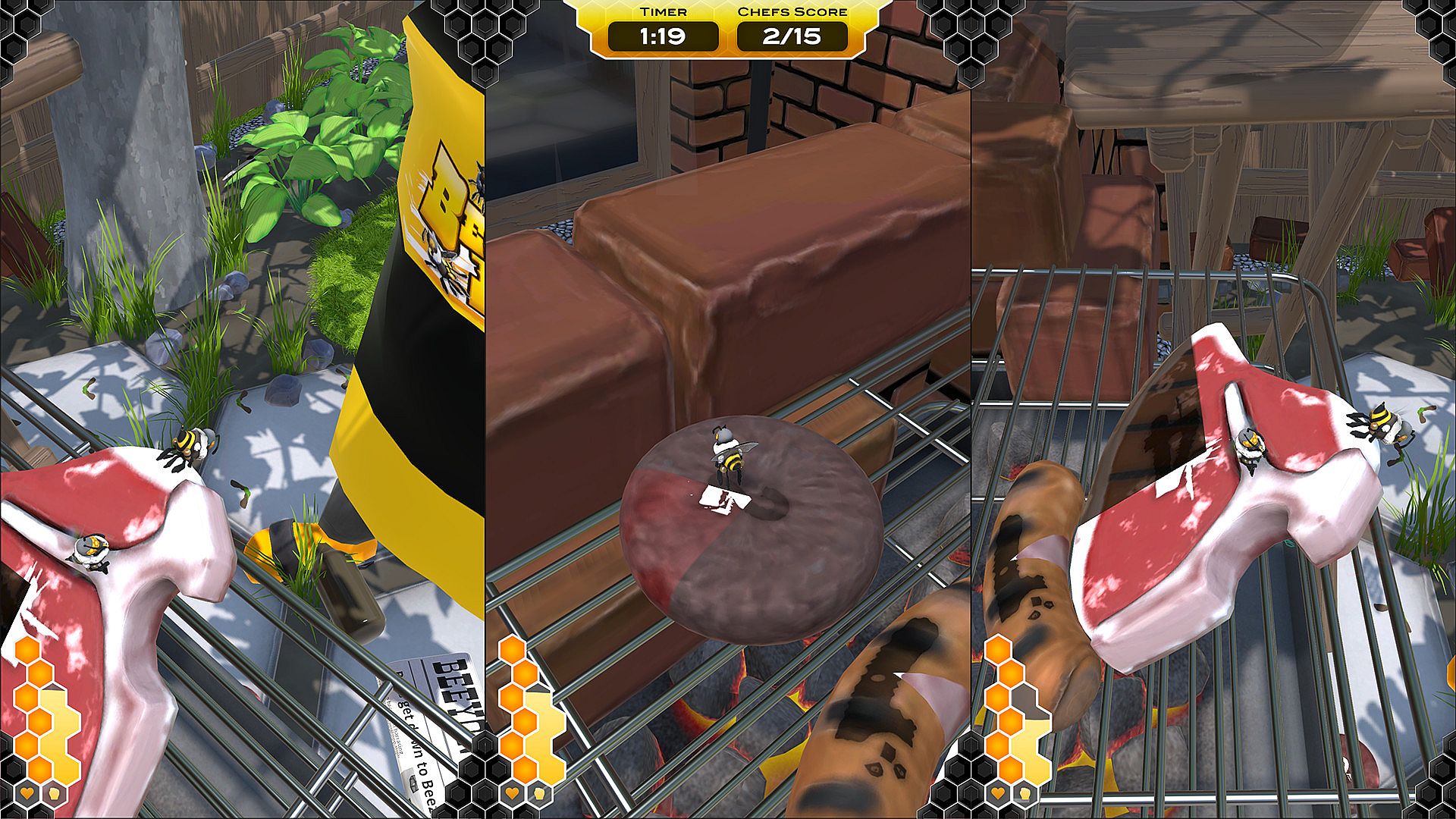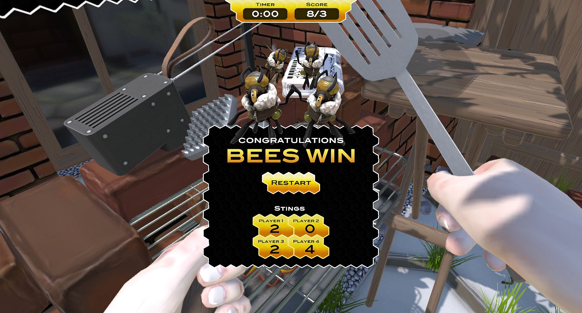 BeeBeeQ is an asymmetric local multiplayer game where one VR player controls a Chef while up to four xbox controller players control Bees. Armed with a spatula and a fly swat the VR chef player has to try cook while the bees steal food, sting and generally harass him.