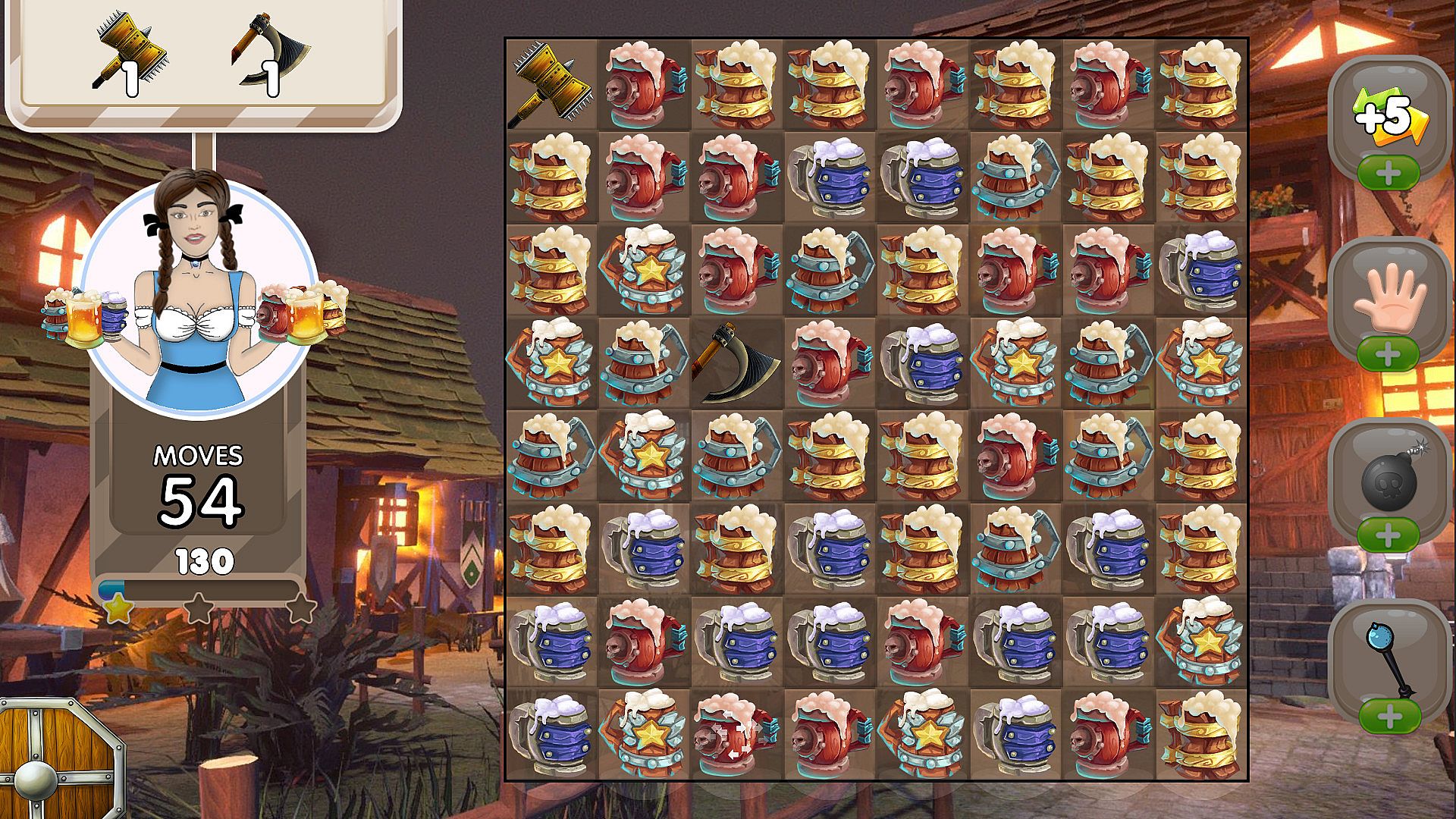 Beer Break is a Medieval themed match 3 game. If you are looking for a more adult oriented challenging match 3 without all of the bright colors this is the game for you. In Beer Break you relive the heroes adventures on the battlefields while traveling the inns and bars of the period. There are several game types there you collect beer steins, spill blood to connected squares, beat a time limit, collect weapons, and more. This game is designed for an adult crowd so it is not going to give you hints on how to beat the level. It is not going to hold your hand and explain every step. You have to learn to play the game by trial and error.