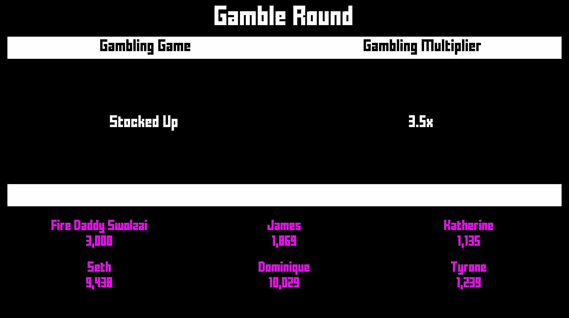The First Category is displayed (Entertainment). Player 1 decides to bet 500 points during this time, locking in a 3x multiplier if they answer the upcoming question correctly. The Second Category is then displayed (Movies) and Player 2 decides to bet 600 points during this time, locking in a 2x multiplier if they answer the upcoming question correctly. The Final Category is then displayed (American Psycho) and Player 3 decides to bet 800 points during this time with no multiplier locked in due to locking in during the final category. The question and options are then displayed with each player selecting a different option. The answer is revealed with only Player 2 selecting the correct answer. Player 2 is awarded 1200 points (600 point bet with a 2x multiplier), Player 3 is deducted 800 points, and Player 1 is deducted 500 points. The round is then complete.