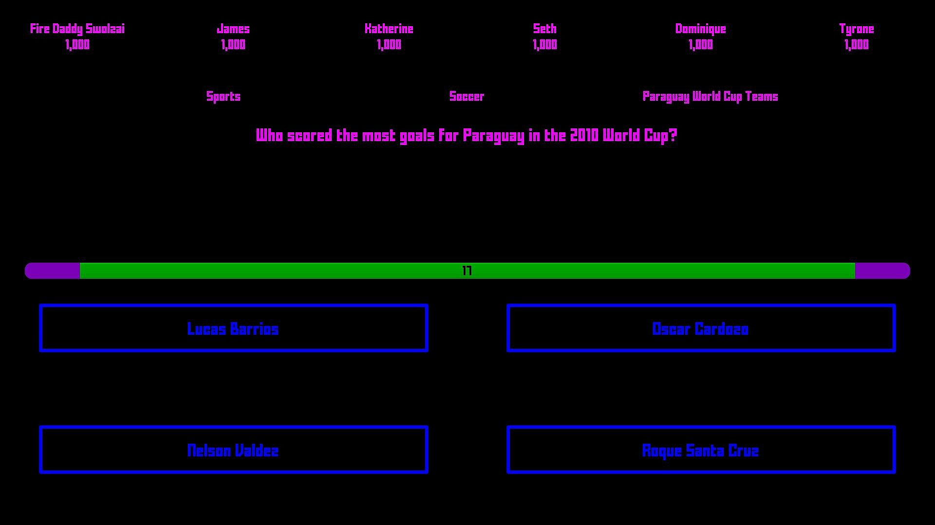 During Trivia rounds, players attempt to guess the correct answer from 4 possible choices. At the start of a Trivia round, 3 categories will be shown scaling from a broad category to a very specific category with pauses between each displayed category. During these pauses, players will be able to bet points with different multipliers based on the current category. After the last category is displayed and all players have placed their bets, a question with four options will be shown to all players; players will have a set amount of time to answer the question by selecting one of the four options. After time is up or all players have answered, the correct answer will be displayed, points will be added to players who answered correctly based on their bets, and points will deducted from players who answered incorrectly based on their bets.Trivia Round Example