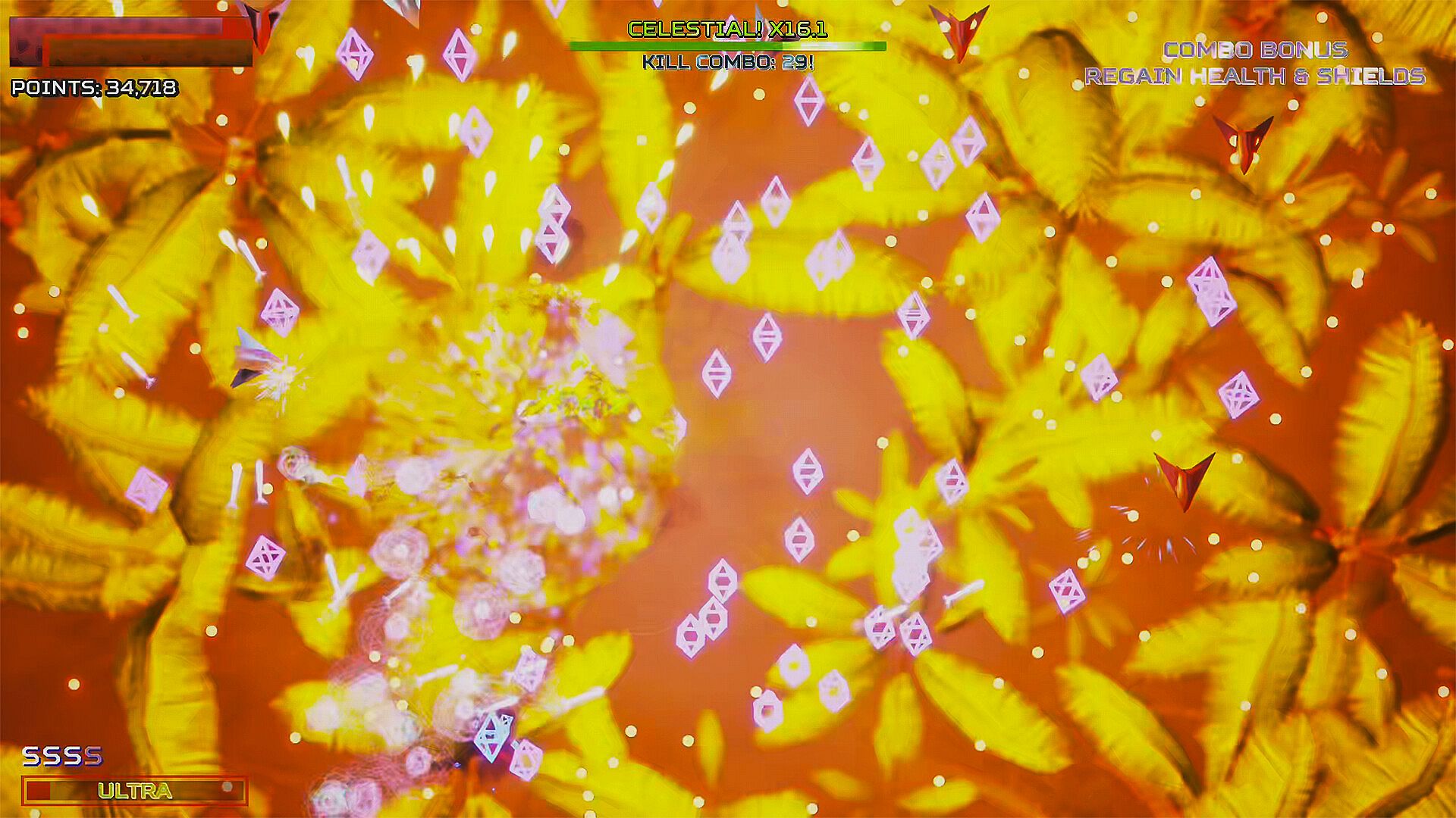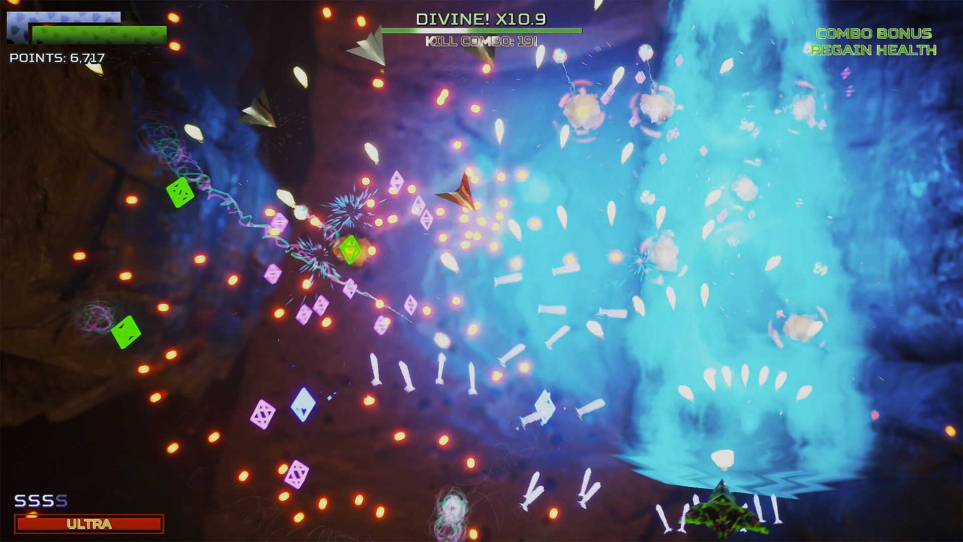 • Ultra AOE that unleashes energy collected from fallen enemies to clear the screen of all bullets and enemies