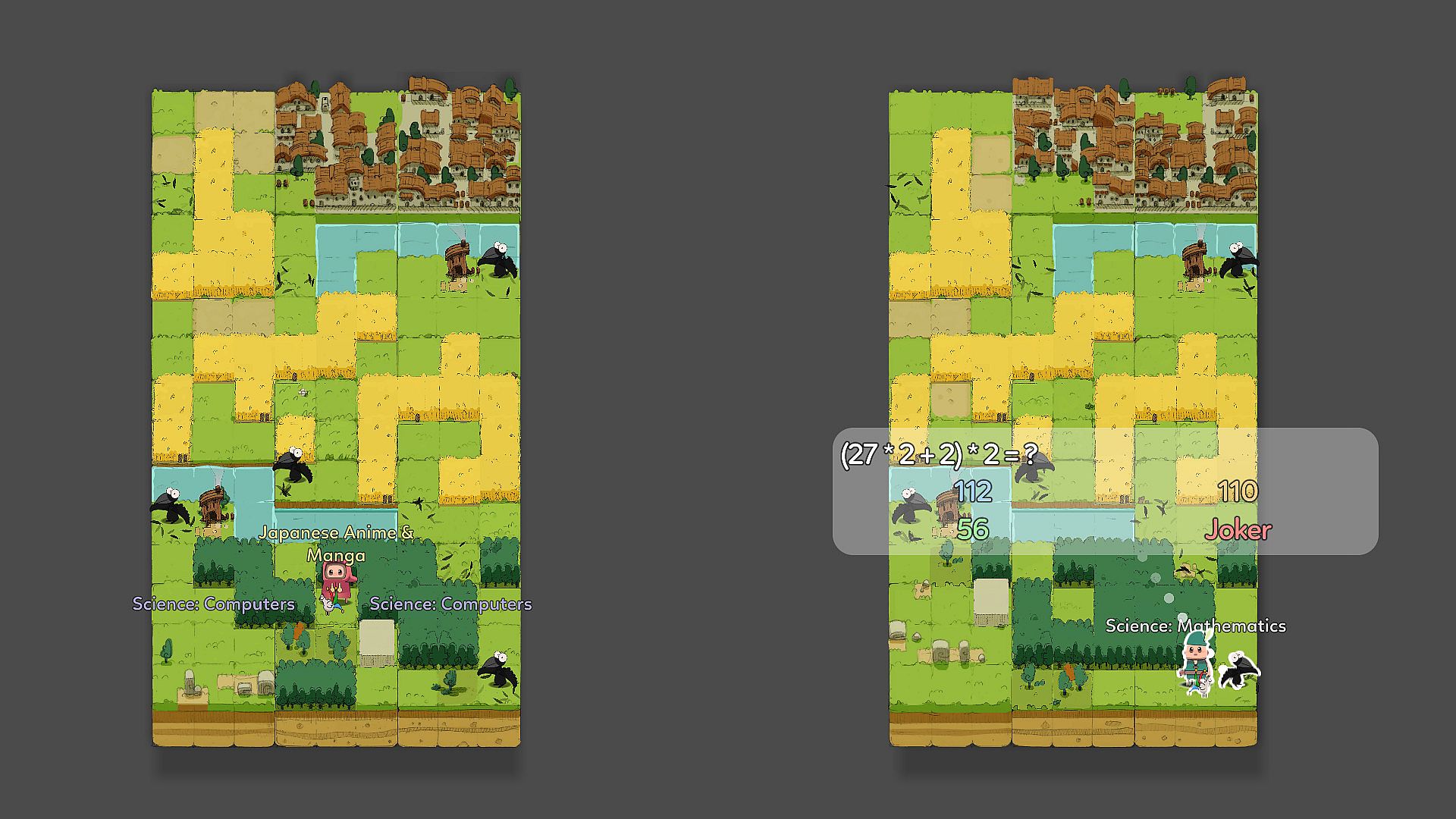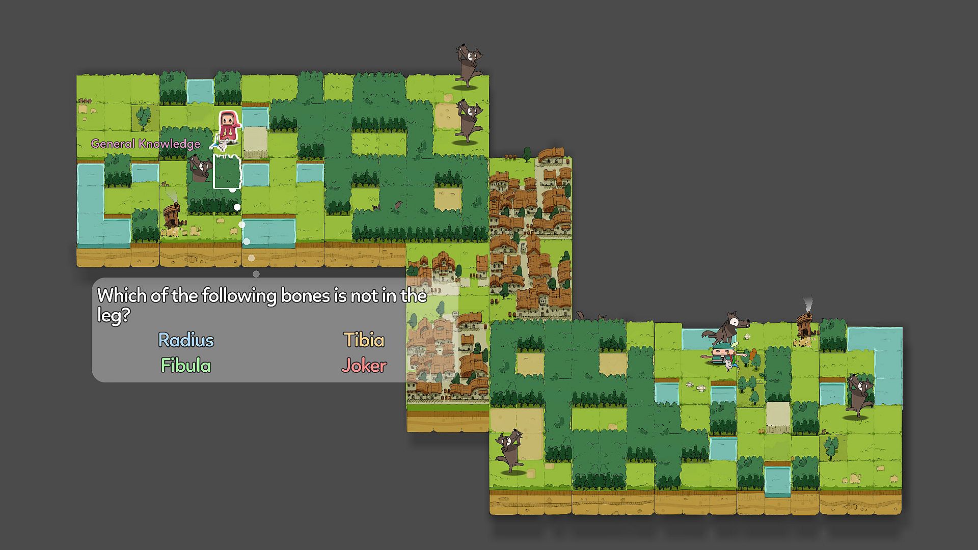 Players are split into two teams, only one person holds the controller for the team. The goal is to be the first team to reach the village. Forests and fields are on your way, to clear the path you have to answer questions. Answer fast, but be careful: a wrong answer blocks the way for good, forcing you to find another way around it.