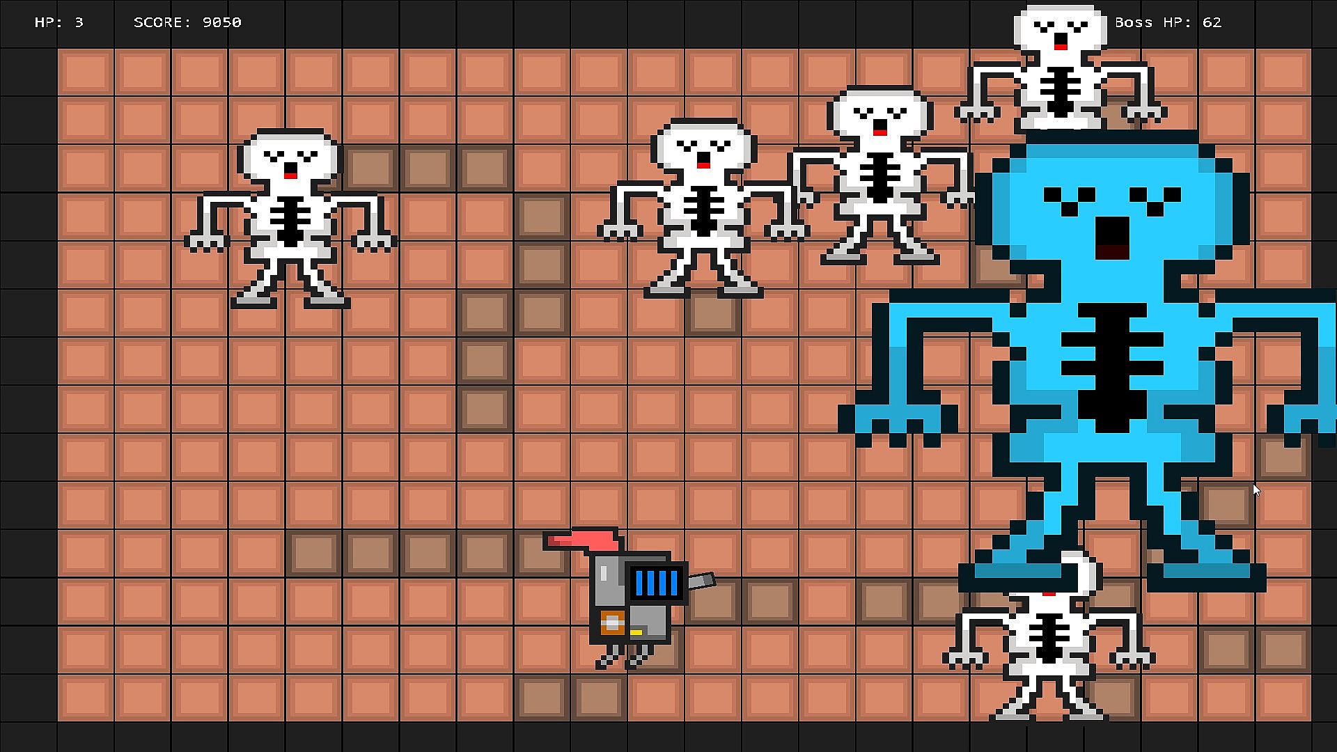 Fight the bosses and save the king. In this top down shooter your goal is to go through each of the three bosses and save the king! You'll have to be careful though because each time you die you restart from the beginning. With 3 health and bosses that you can't touch, have fun trying to get through this challenging top down shooter. Try and save the King from a skeleton, ogre and dragon!