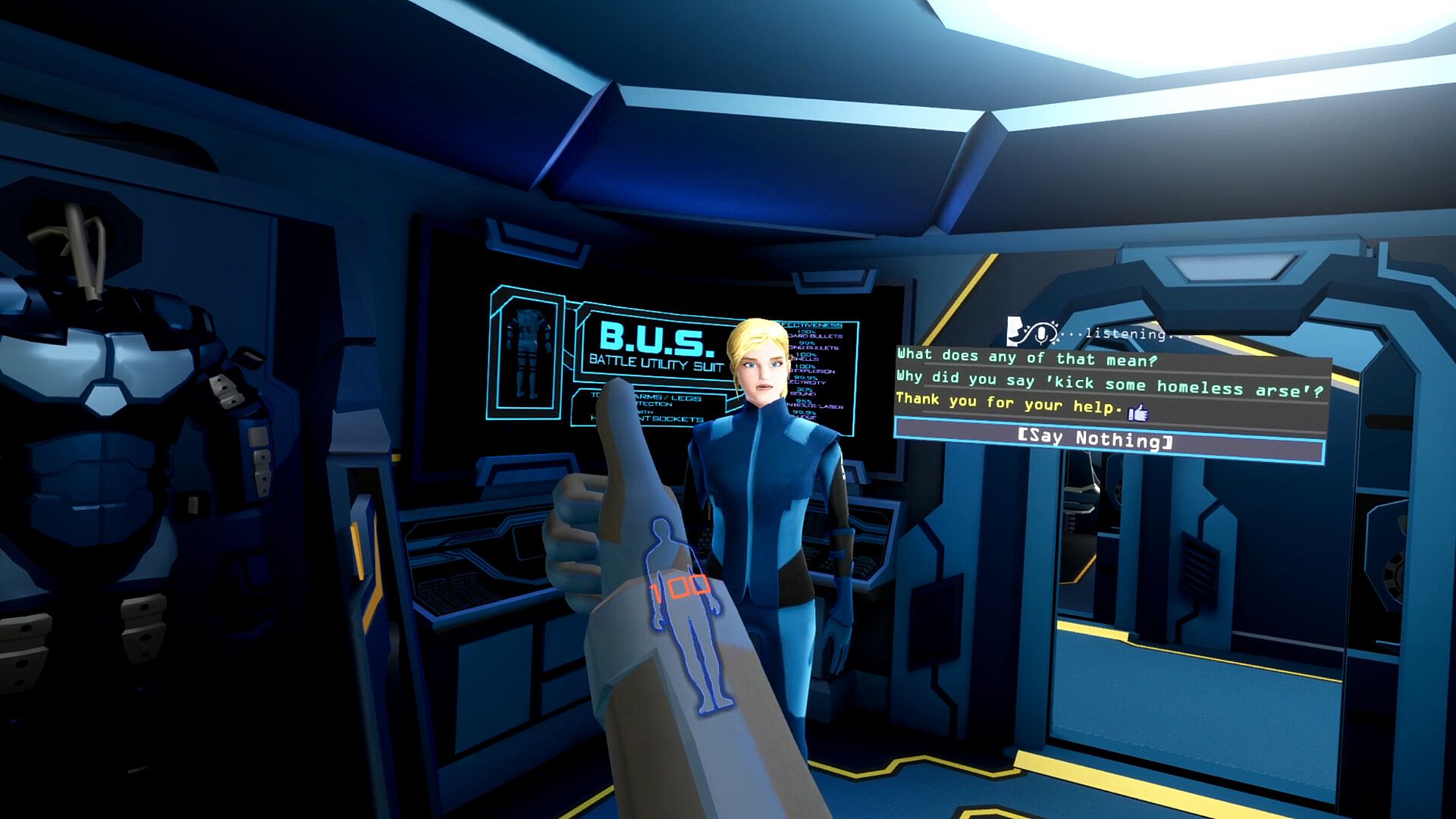 • Manage a variety of weapons, equipment and features through interactive screens embedded in your virtual arms.