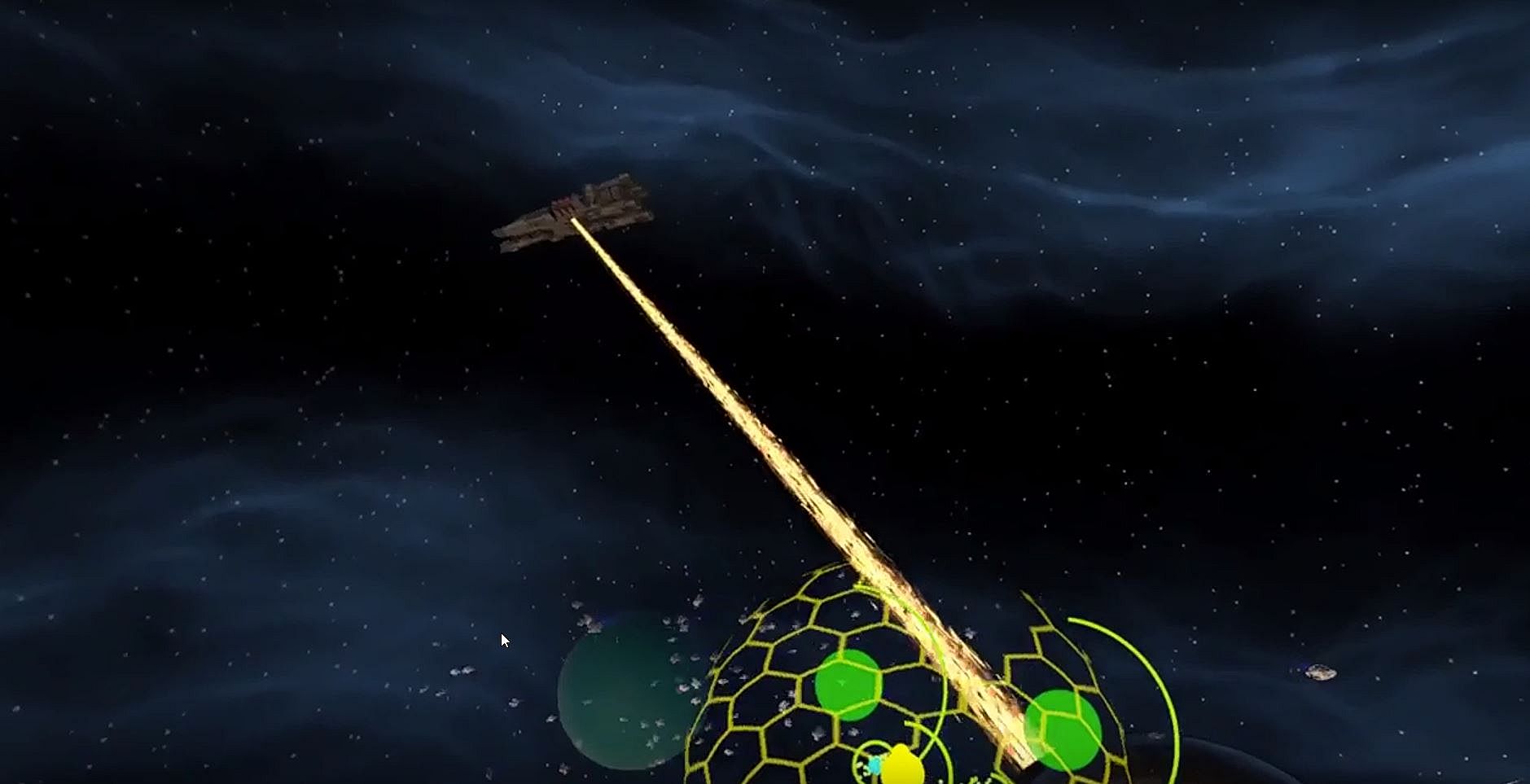 Ones the magneto ray gun is initiated, there is only one hope for the cargo ship left: for a short period of time a fighter can block the havoc by flying his spacecraft directly into the deadly beam. In military slang it's called "red-hot-hand". You can order your squadron to this defence move by keeping the trigger squeezed on the controller of the particular side. Use red-hot-hand when, and only when the enemy is firing to avoid unnecessary casualties.