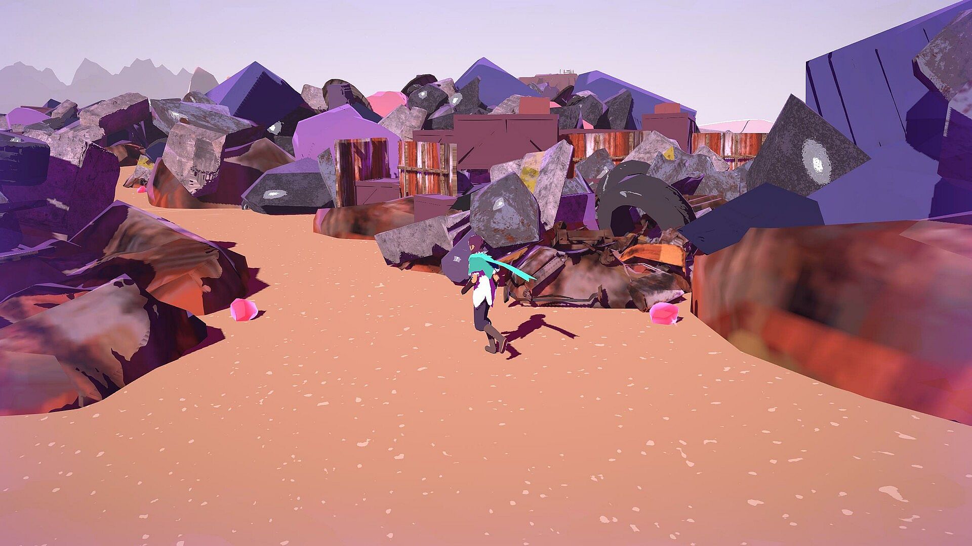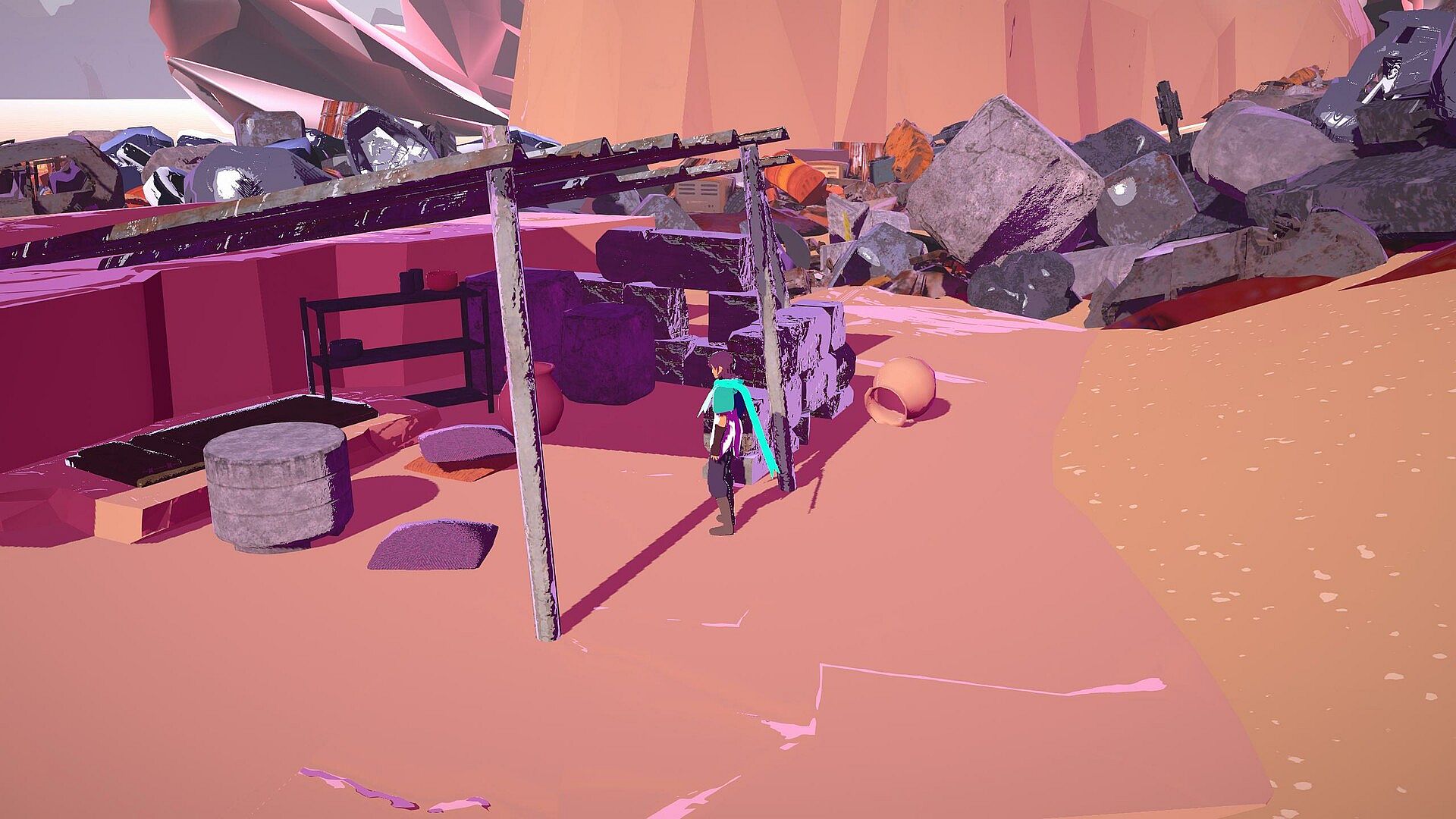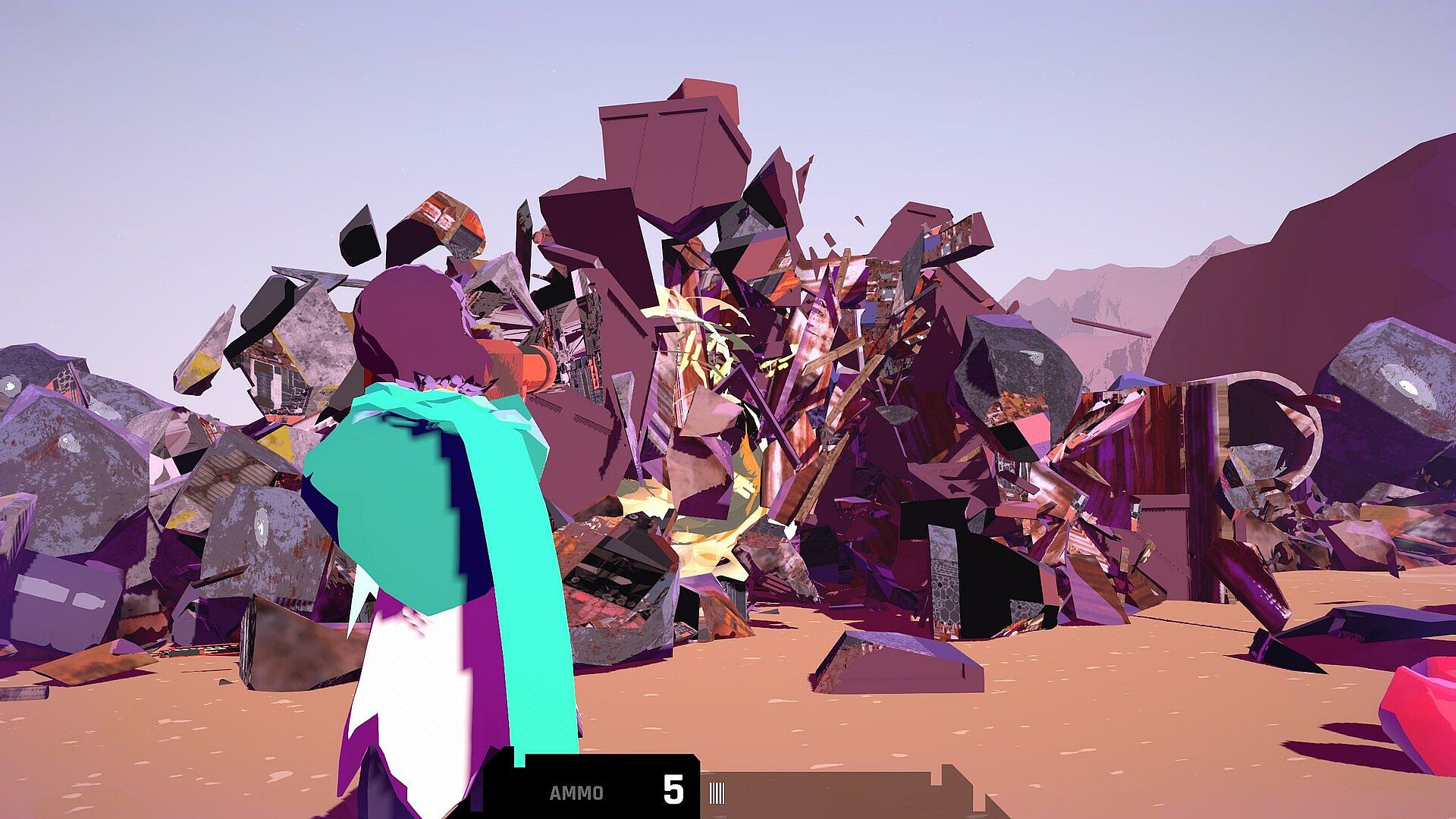 Danger looms over the distance, but none of it is immediate; there are no enemies or hazards in the scrapyard, only layers upon layers of trash and the open sands. And guns, which you can use to blow up the trash: