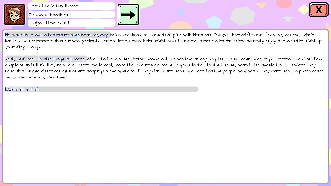 Dialogue: A Writer's Story is a game about conversations, writing and science. In Dialogue, you play as the writer Lucille Hawthorne, exploring characters and events through a year in her life via mostly ordinary, and occasionally fantastical, conversations.