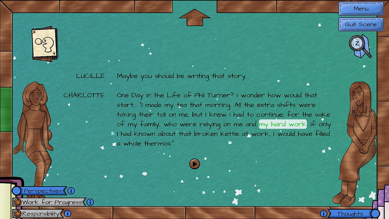The first is the creative process, both in Lucille's writing of her novel, and other people's reactions to it. The player gains insight into Lucille's struggles and triumphs as she changes characters, creates twists in the story and struggles to find a satisfying conclusion.