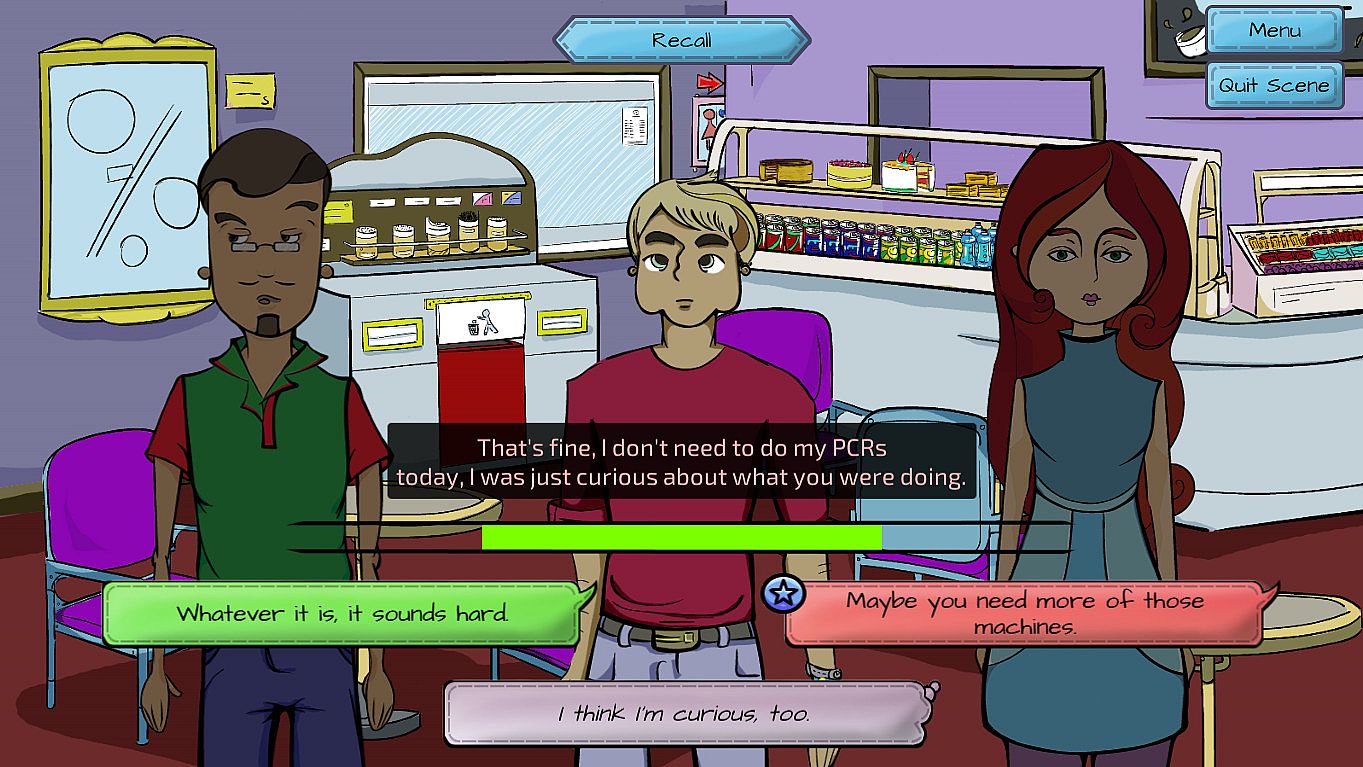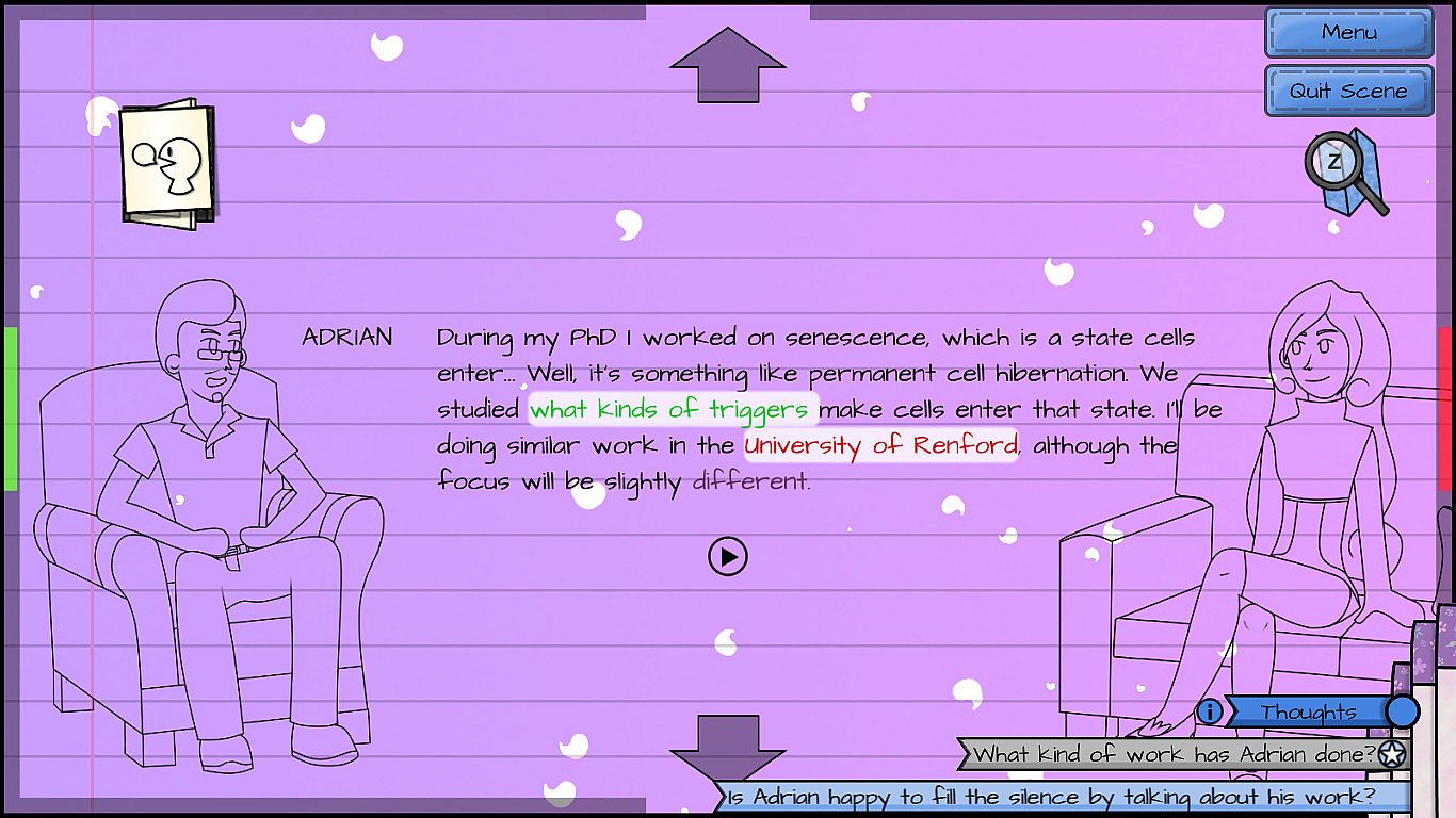 The second is how real scientific research is carried out and how it is seen by people outside of the research community. Adrian's year is focused on working with his unruly cells, and the player gets to experience the genuine worries and joys of being a researcher.