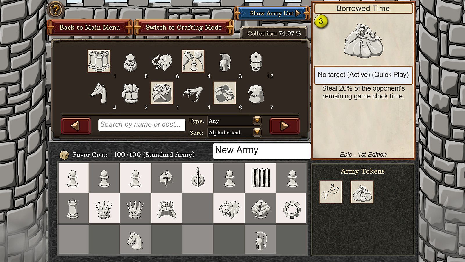The rules of the game change depending on which tokens you pick for your army. Start with a whole extra row of pawns, create a knight at a weak point in your opponent's defense, or change the win condition to include capturing all of the opponent's minions.