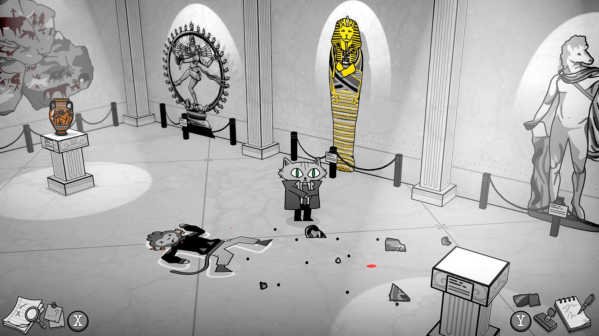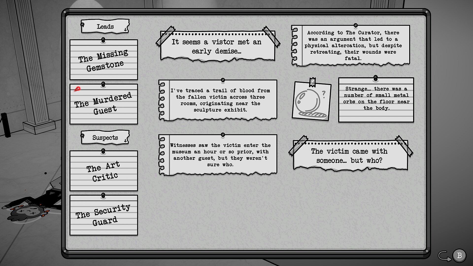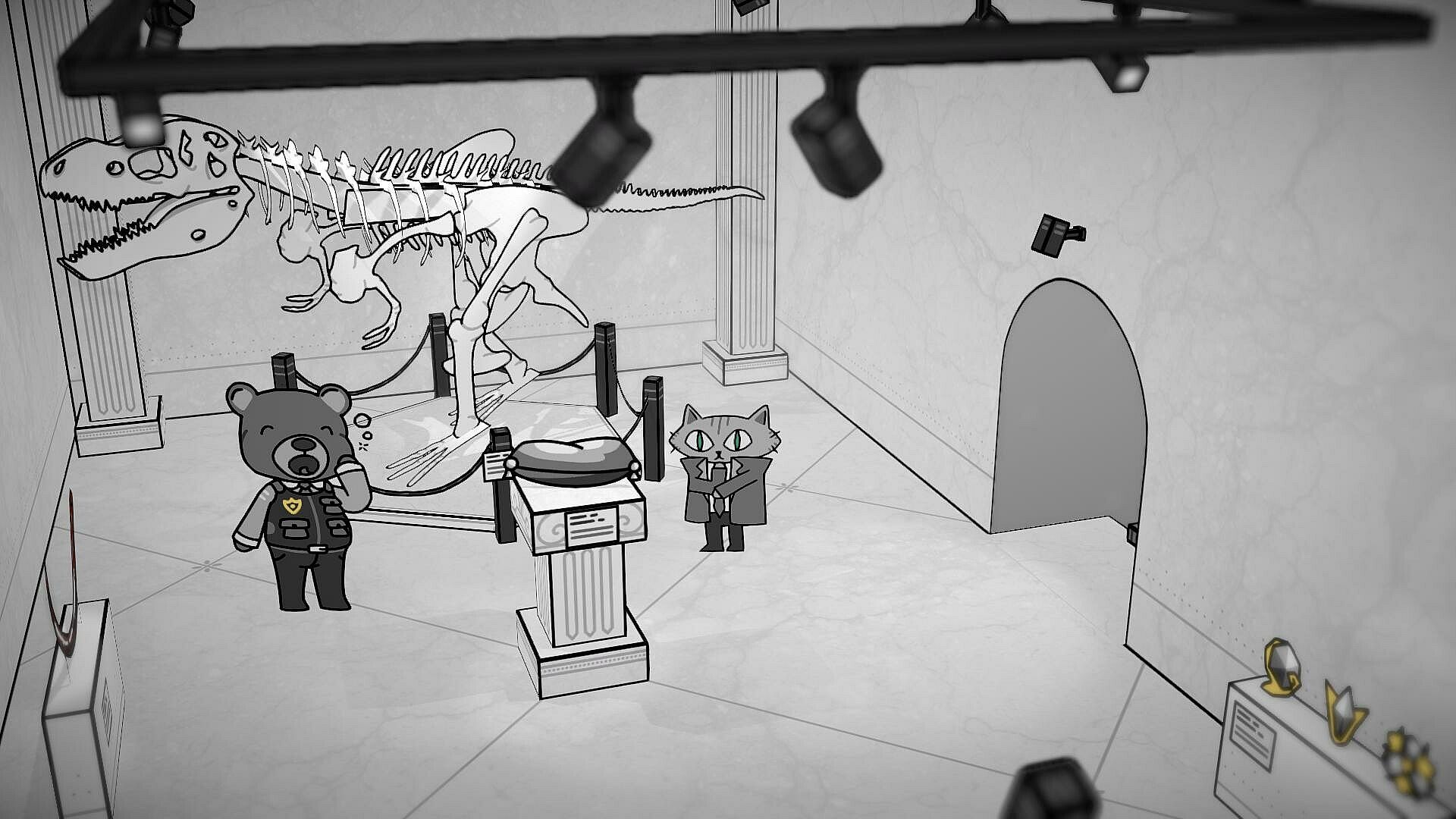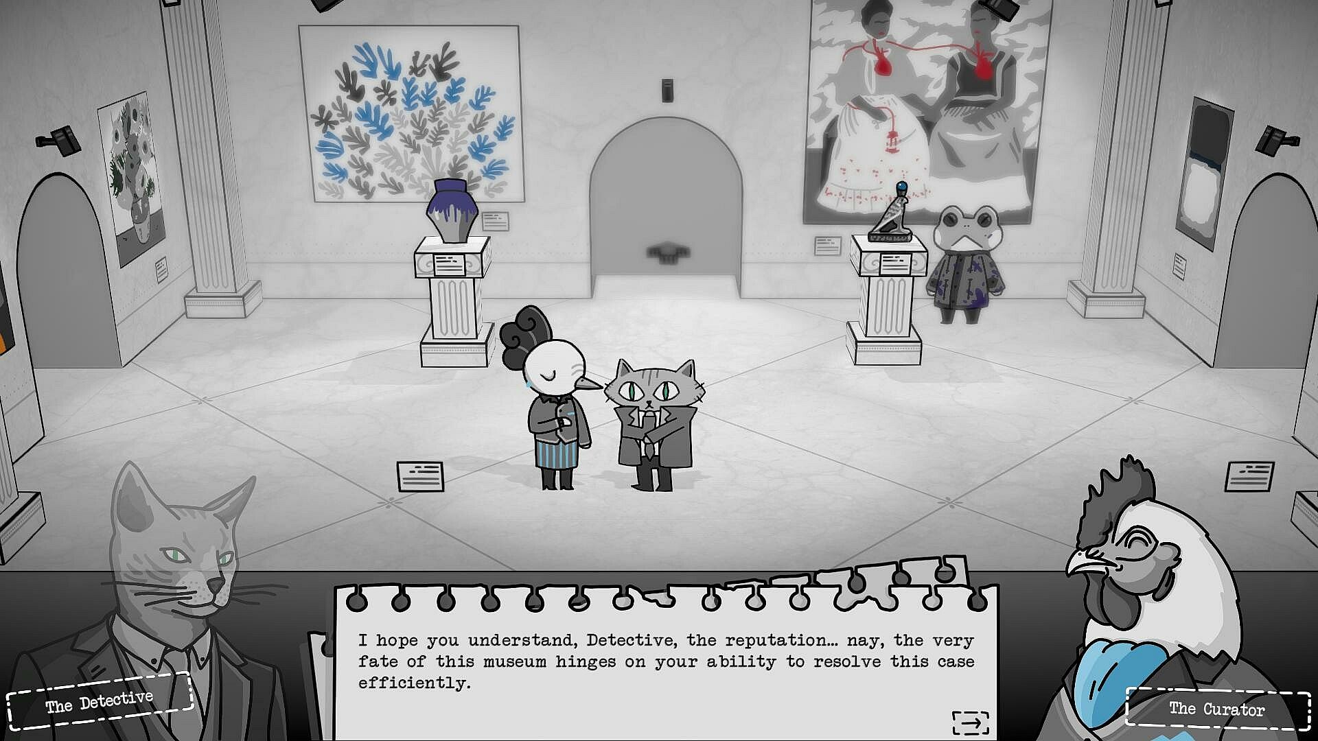 A failed investigation could mean that terrible criminals walk free, and a once-thriving museum will finally bite the dust. The uniquely hand-drawn style of its many displays would be forced to auction. The whimsical yet haunting atmosphere of the museum building itself could be abandoned, or worse... turned into a retail electronics store. The jazz soundtrack, composed of saxophones, plunger trumpets, and speakeasy pianos, would slowly fall into forgotten memory.