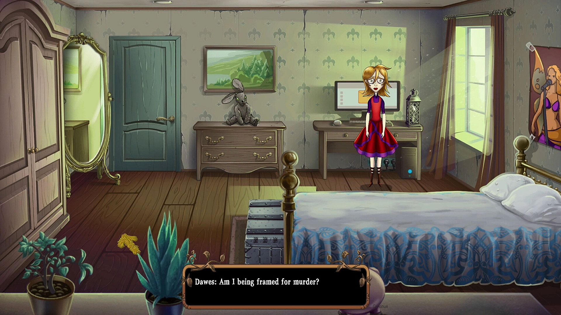 Framing Dawes is an atmospheric adventure game following teenager Bay Dawes on her journey to find and bring a missing boy to the asylum where her mother is being held captive before the end of the day. If she doesn't, she will be framed for his murder and never see her mother again. Accompanied by her dead pet rabbit, Dink, they explore the hidden world beneath her town of Foresight in a flying bathtub to recover missing memories and rescue her mother.