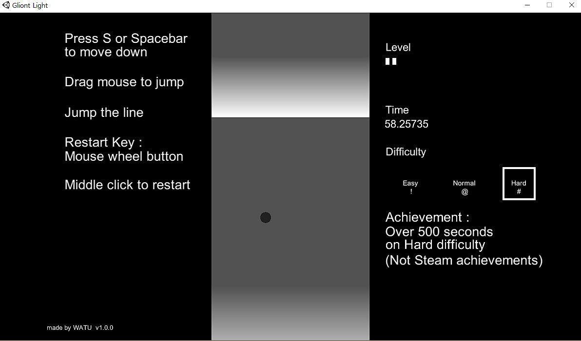 Jump over descending lines in this tense casual survival challenge on PC. Drag the left mouse button to leap across the line, which drops at random speeds, or hold the right button to descend safely. Touching the line triggers a white screen flash that builds to full whiteout for game over. Levels ramp up over time with lines spawning quicker and fading to dark more gradually. Players master precise jumps and drops to push endurance limits. Casual gamers seeking quick, reflex-driven sessions find the perfect bite-sized test here.