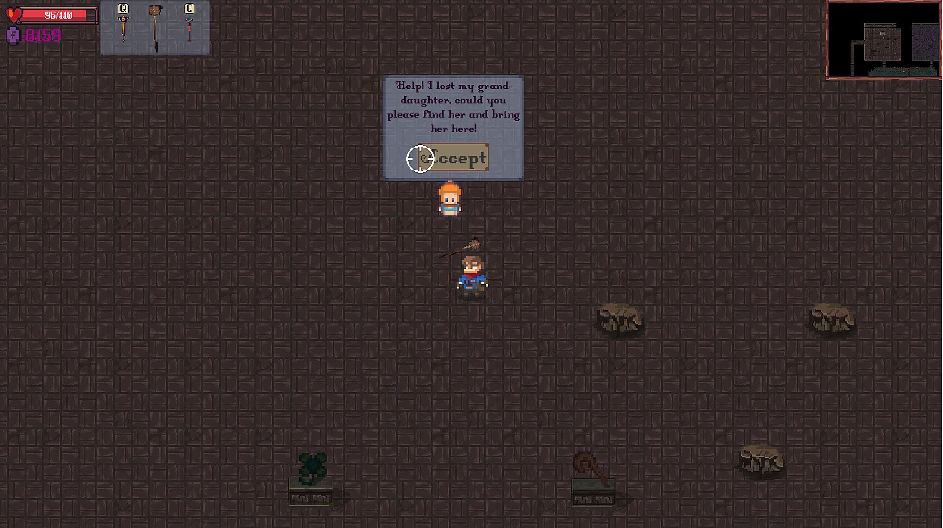 Eat a magic acorn, attach a rearview mirror, or simply pocket a few rocks! Careful though, these items won't follow you out of the dungeon should you perish.
