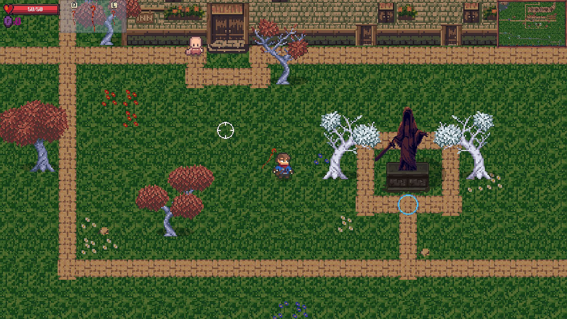 **(Lose items, weapons, and return to town on death, a few lifetime upgrades are available in town from the statue/rescued NPCs.)