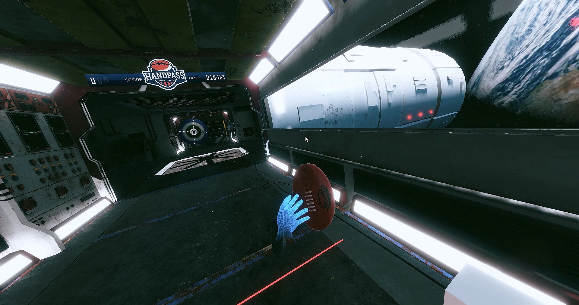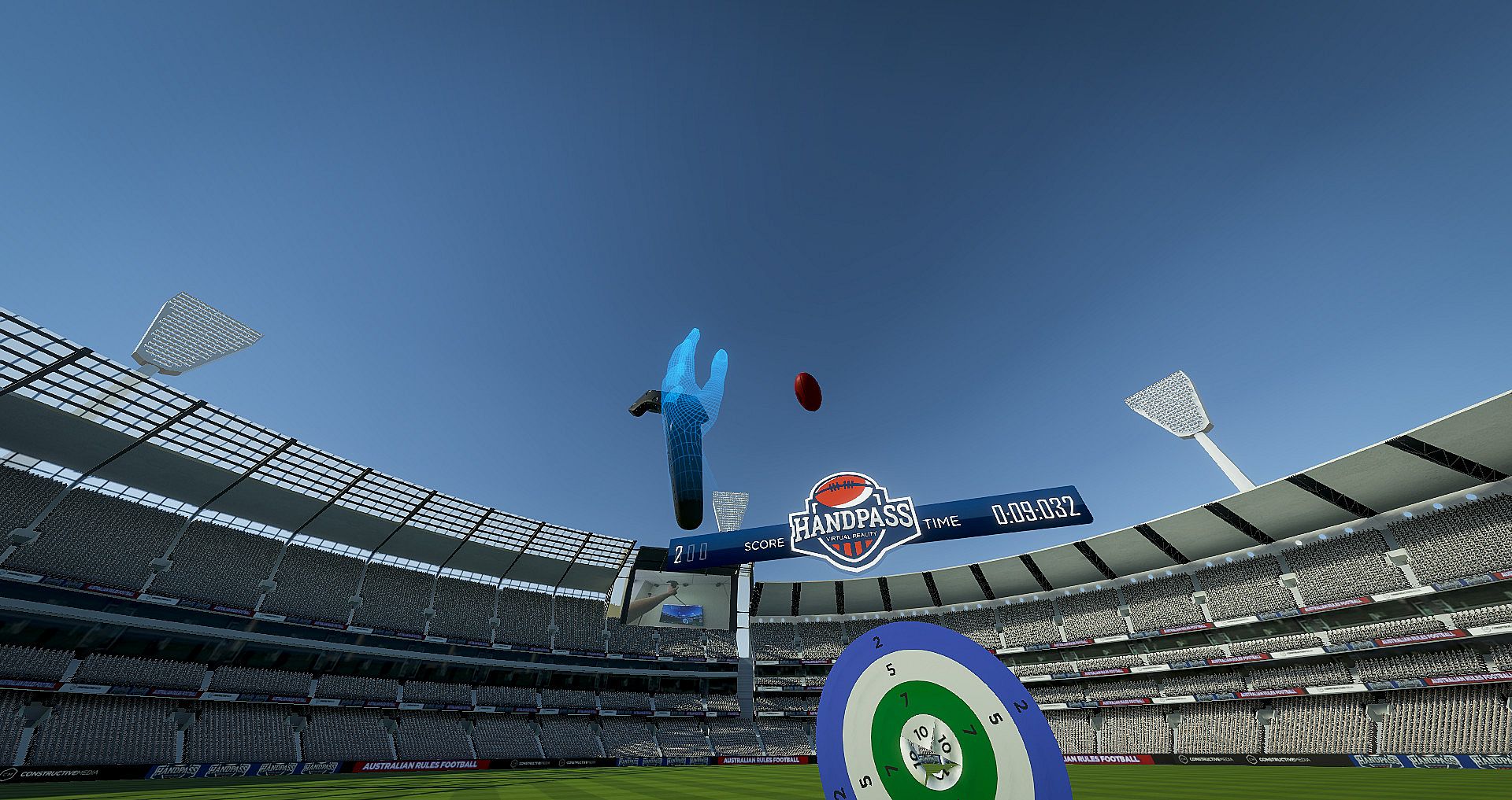 A handpass is a skill in the sport of Australian Rules Football - hold the ball in one hand and punch it with the other! Handpass VR will test the accuracy of your handpasses with moving targets - and in a variety of environments from a stadium to outer space!