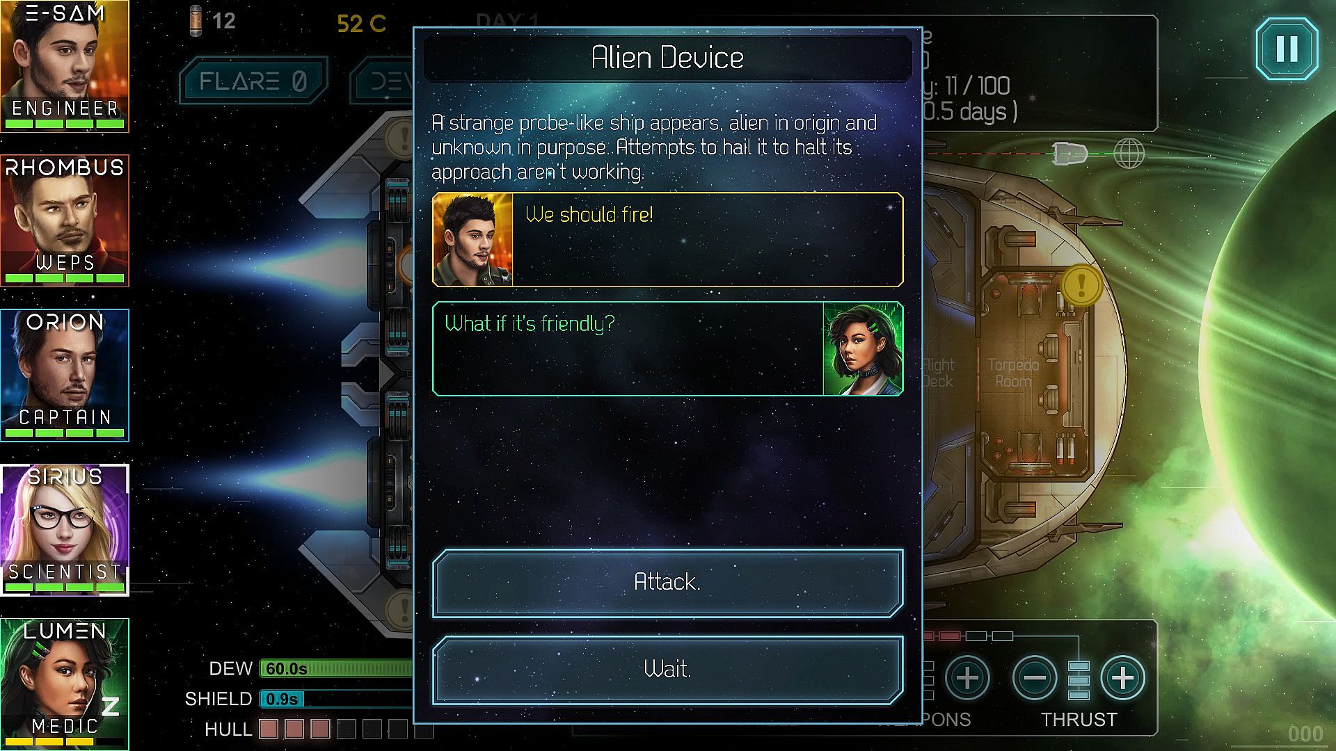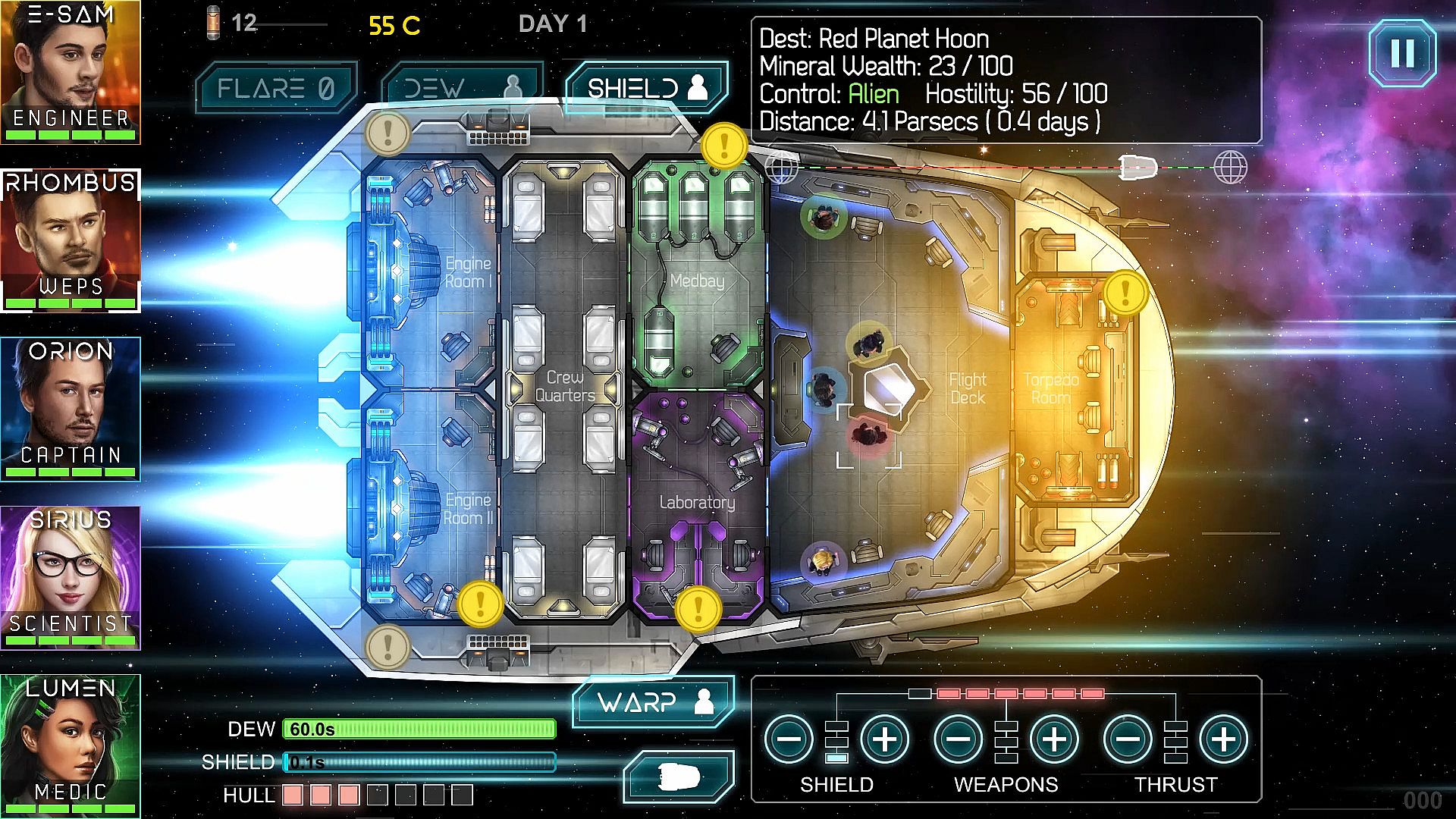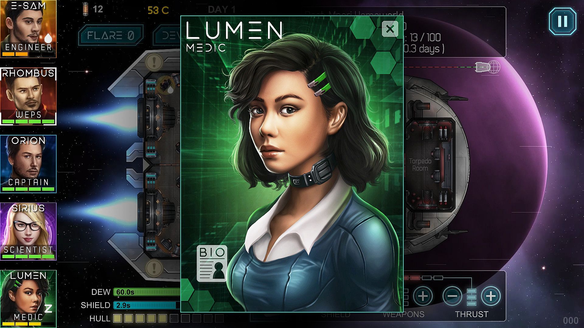 The essence of the Heliconian is to manage a mixed crew of renegades aboard the starship Heliconian. The idea is to manage the crew member’s actions and the ship’s functions to survive as long as possible while exploring the vast galaxy in the hopes of earning upgrades and ultimately a safe haven.