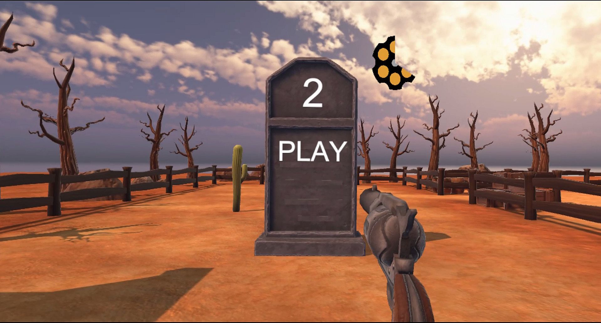 Shoot the button to play, or the tombstone to restart the game.