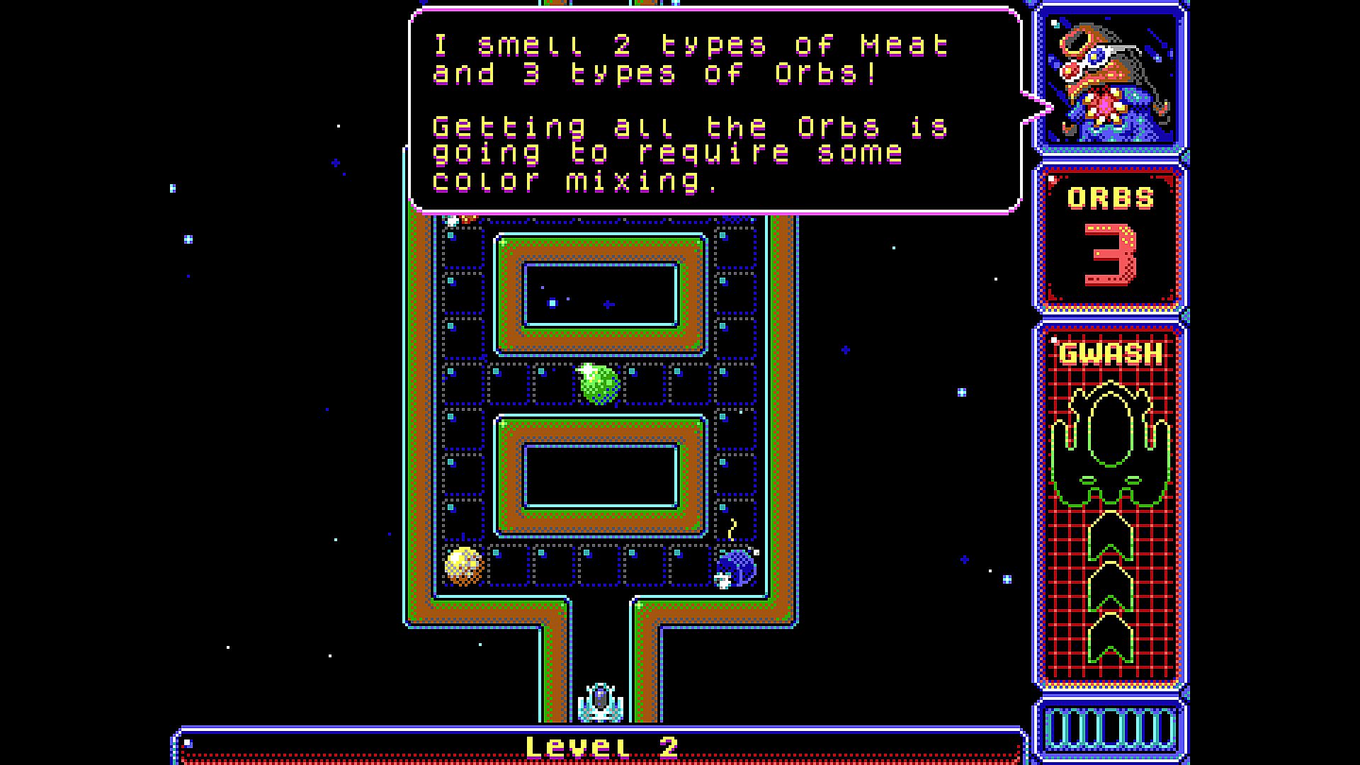 With a suction, only pure evil can muster, Monochromulus sucks up the color orbs and delicious meats of EGA. For he loathes the vibrant colors of the cosmos and intends to mix them all together and cover the universe in brown techno gravy. Only you can save the universe from a monochromatic gravy drenched future!