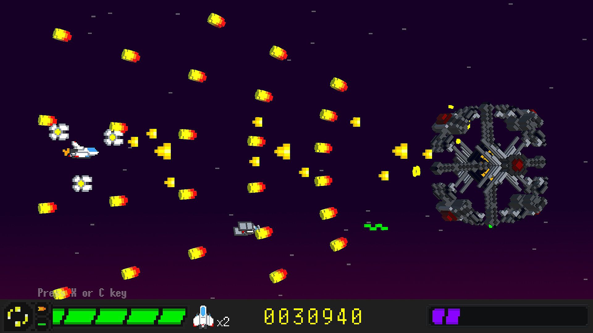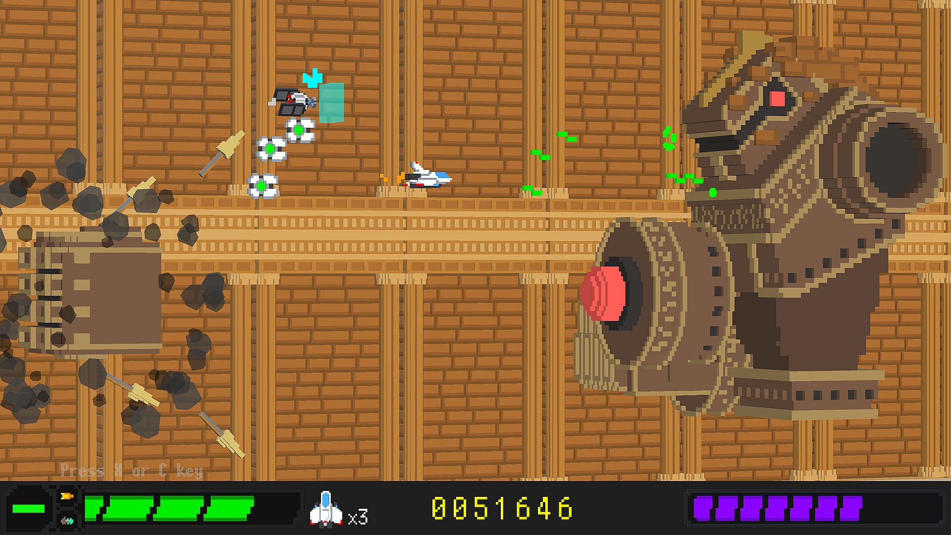 Blast through waves of enemies in this 2D side-scrolling indie action shooter set in a voxel-built world. Players advance stage by stage, defeating foes, grabbing scattered reinforcement items, and battling unique bosses with fresh gimmicks. Switch shots with C/V keys, drop into low-speed mode via Shift, and pass option cannons to a second player in multiplayer for up to two. Retro graphics pair with diverse enemies and adventure-sparking stages, each featuring distinct background music. Keyboard and gamepad controls keep action smooth-arrow keys or left stick for movement, Z or A to fire. Score attacks heat up as players master satellite entry for the second player and barrier tactics, delivering simple yet deep indie action gameplay for retro shooter fans.