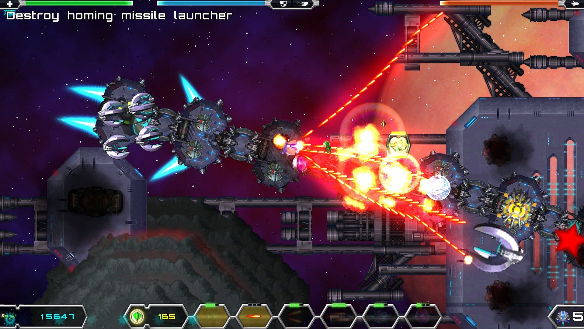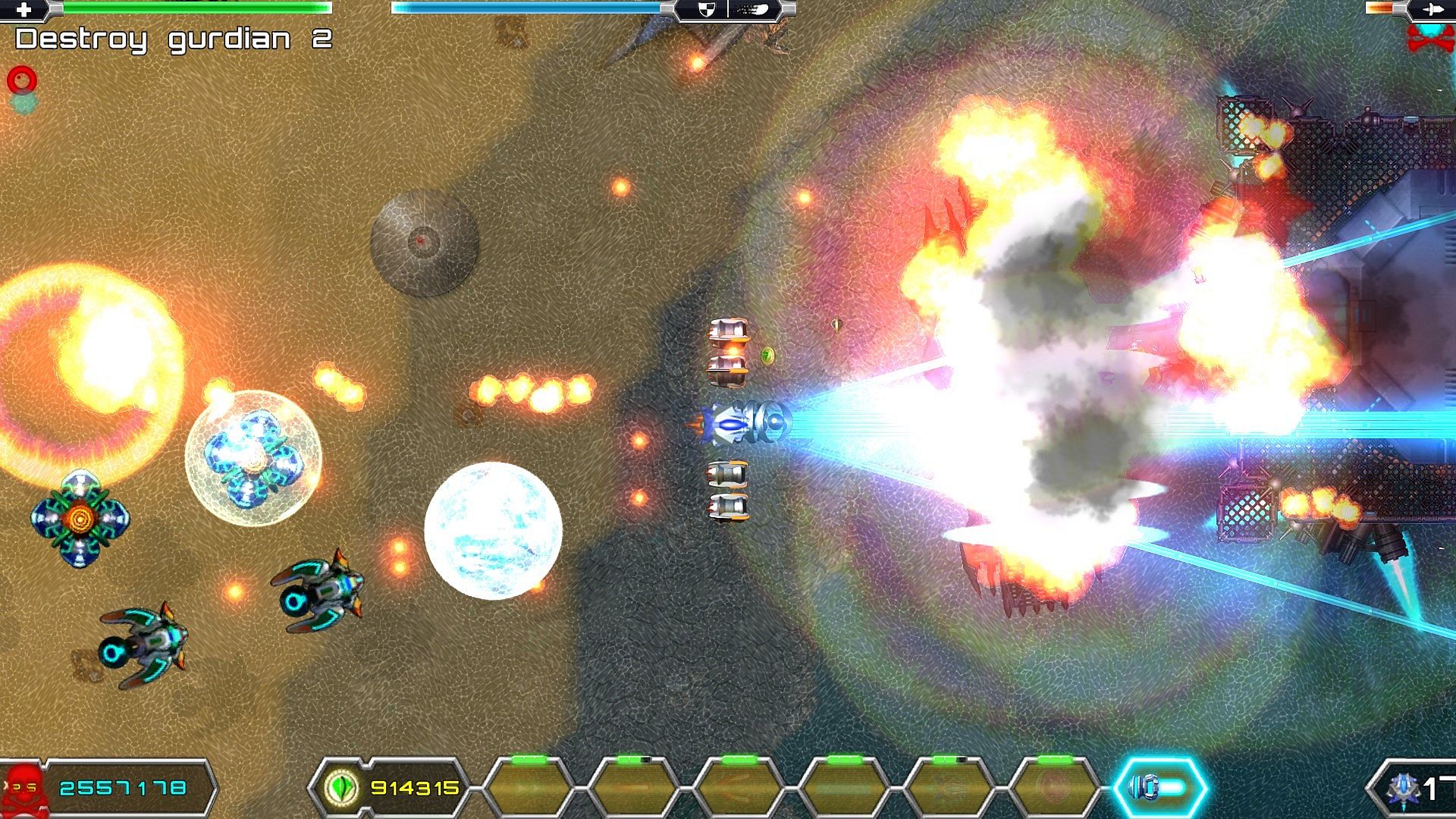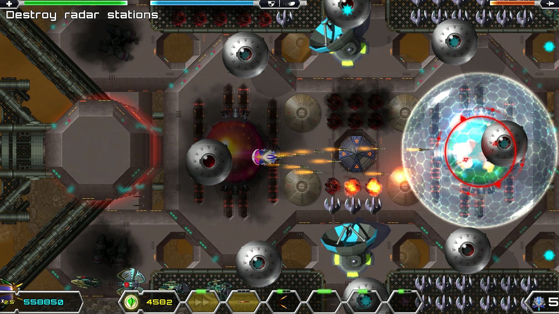 At the beginning of each game the player is given some basic weaponry as well as the ability to upgrade it during the level. The weapon and system upgrades which are currently available to the player are shown along the bottom of the screen along with how many upgrade credits the player has collected (similar to R-Type). Each upgrade will also show what level they are at by displaying a small progress bar in the upper right of their graphic. Later in the game the available upgrades can be changed. (NB: All references to shop, credits or currency is virtual, no additional spending is required for this game).