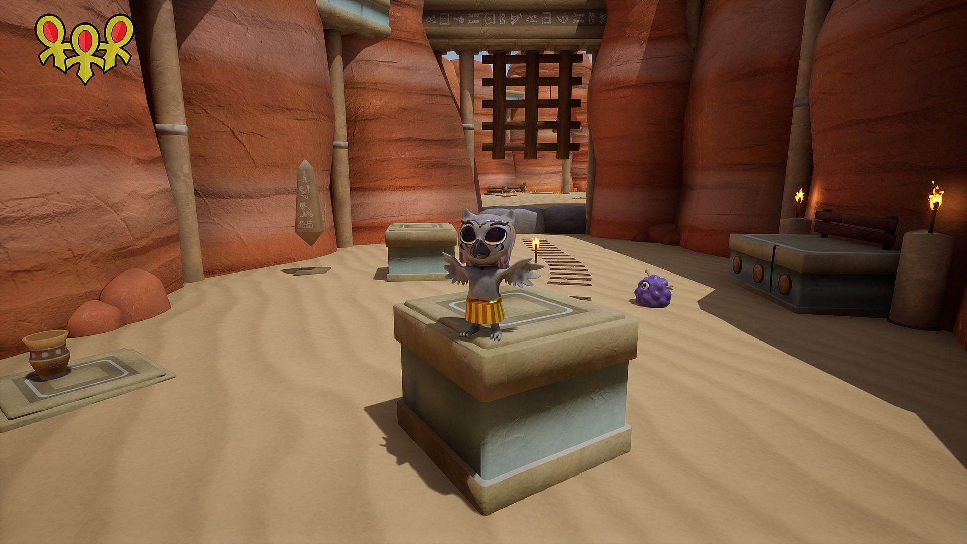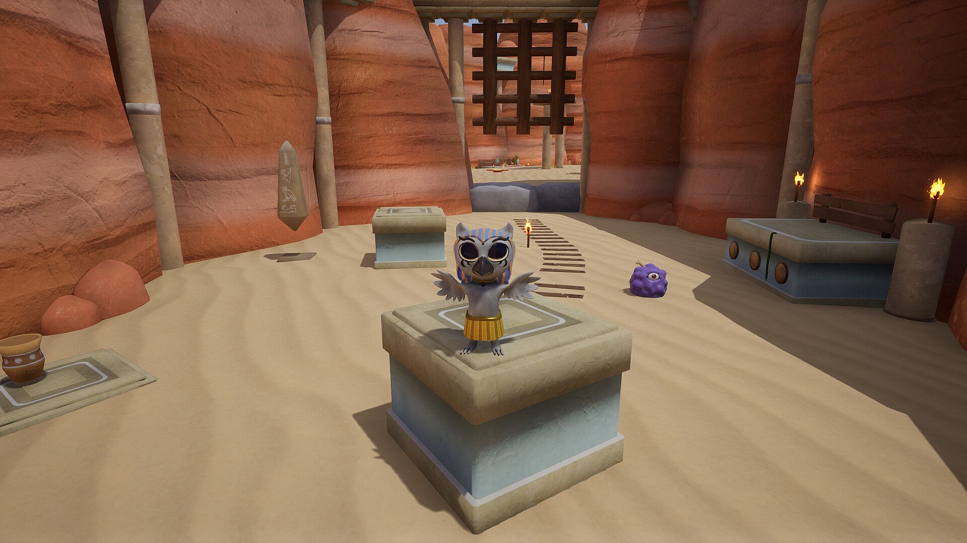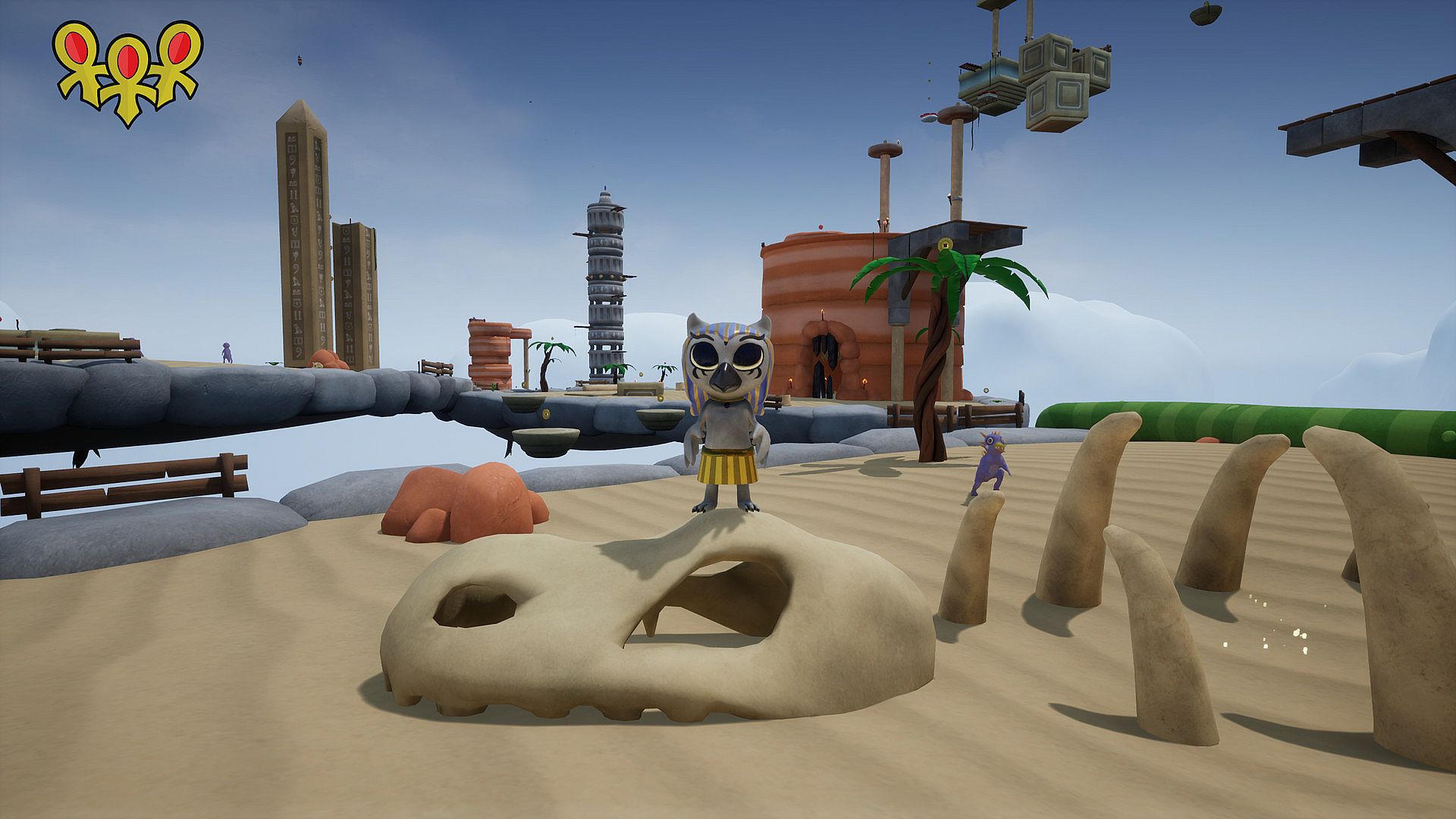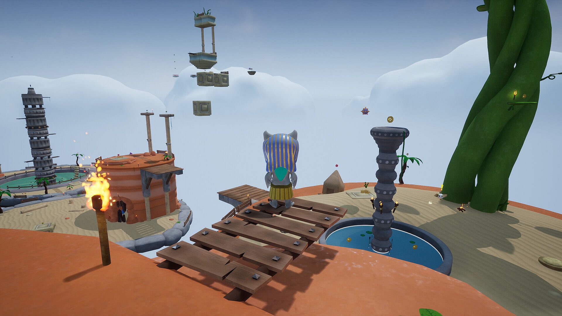 Jahto: Savior of the Sky features a tutorial level, a central hub world, and a variety of themed environments, such as deserts and snowy landscapes, all accessible through mystical sky portals.