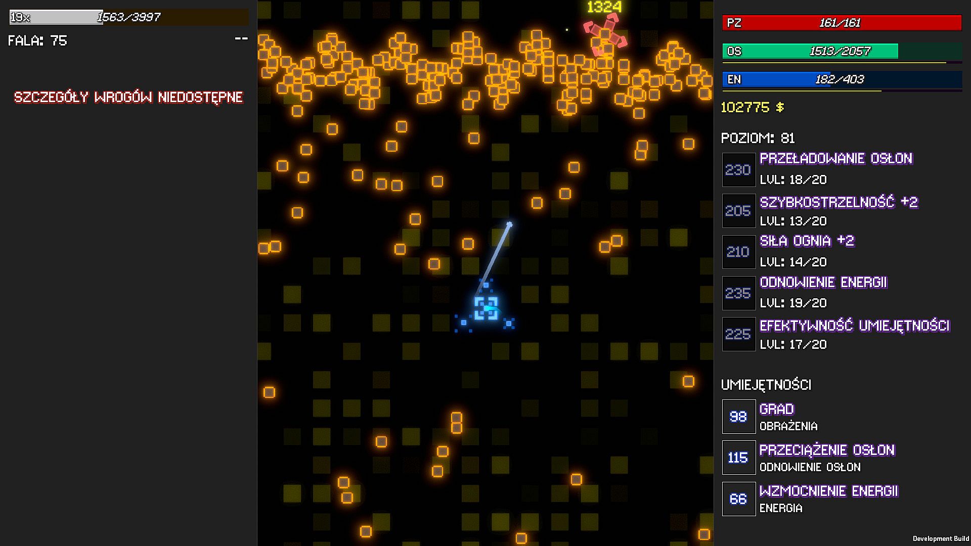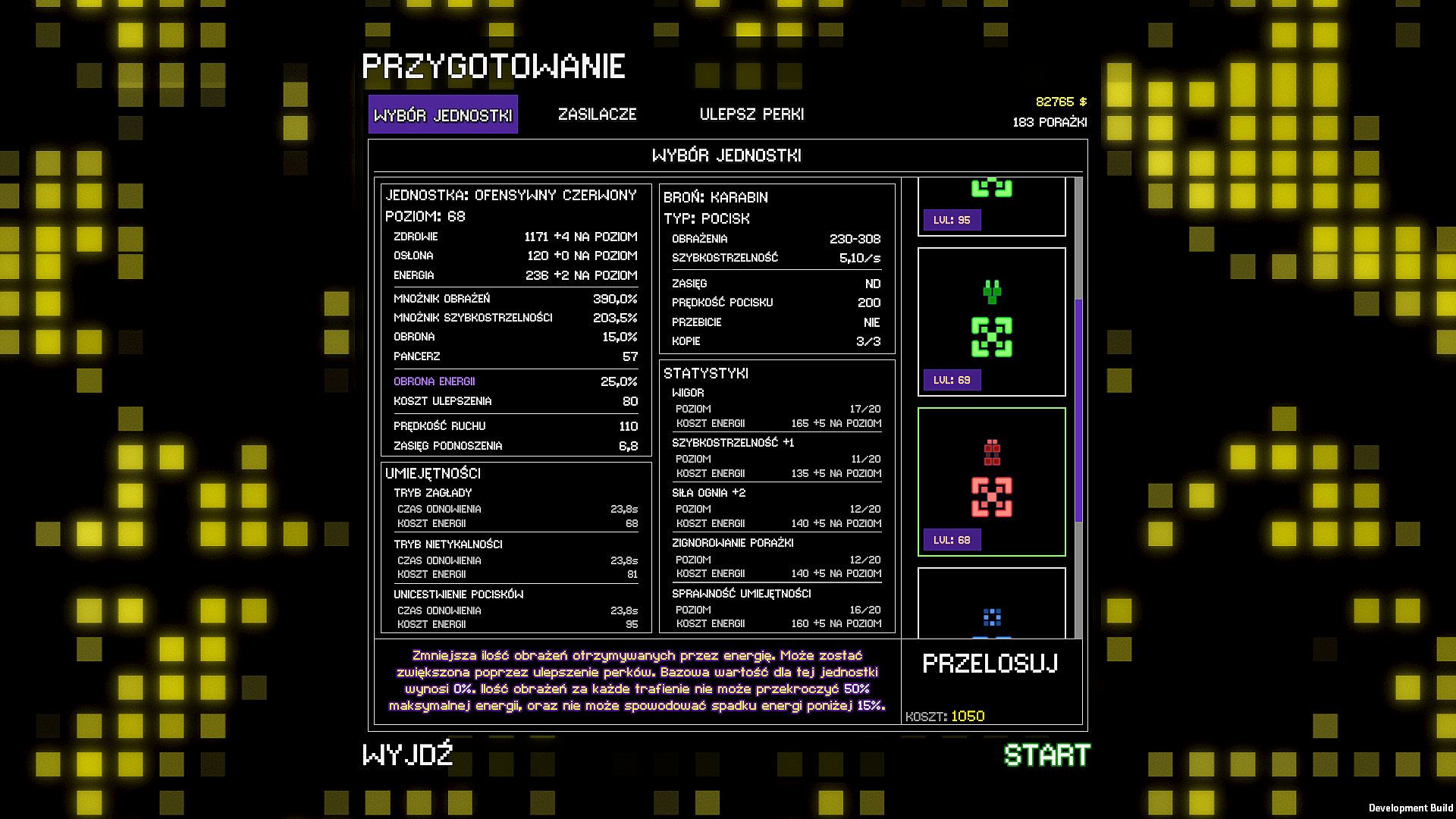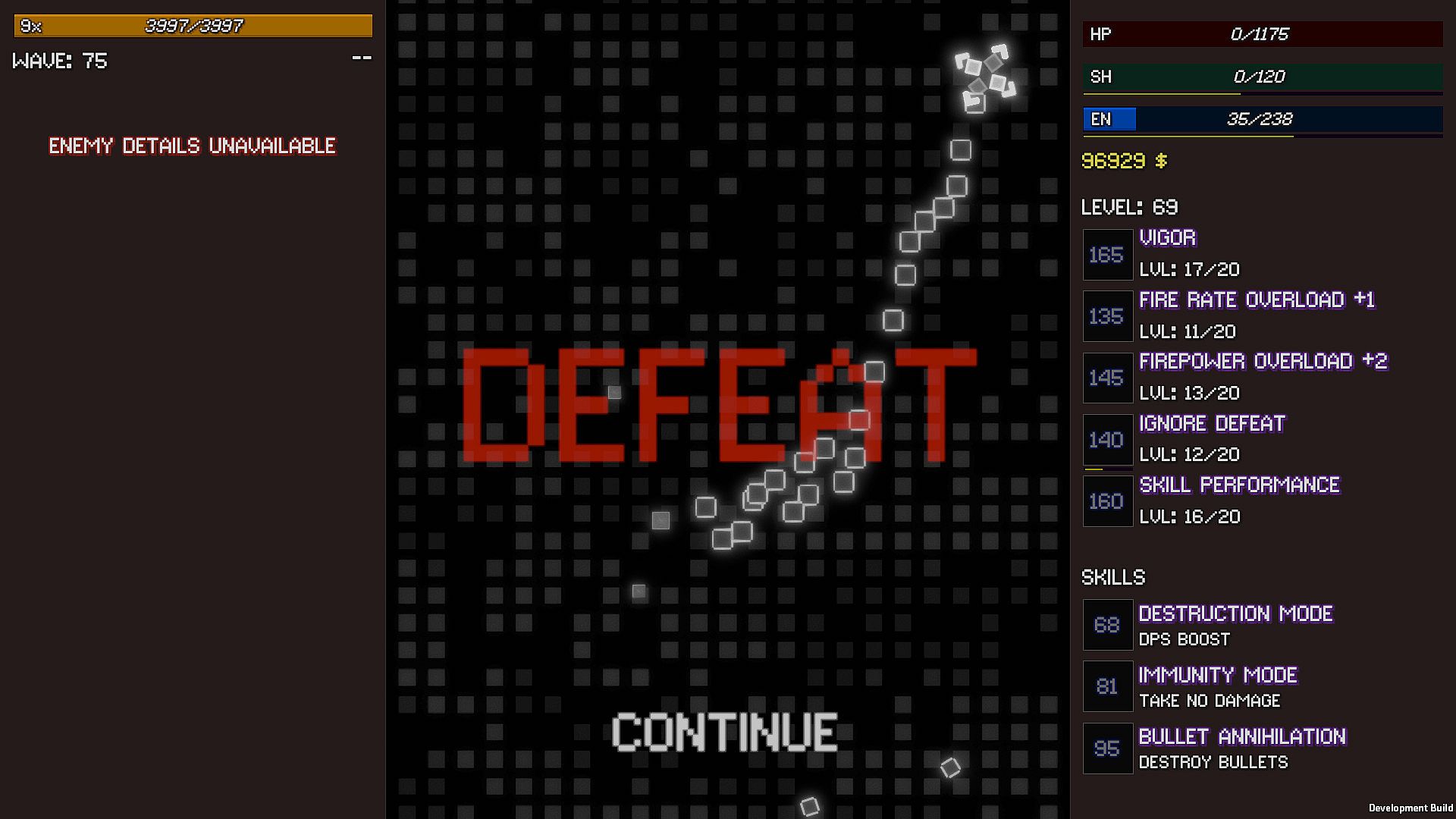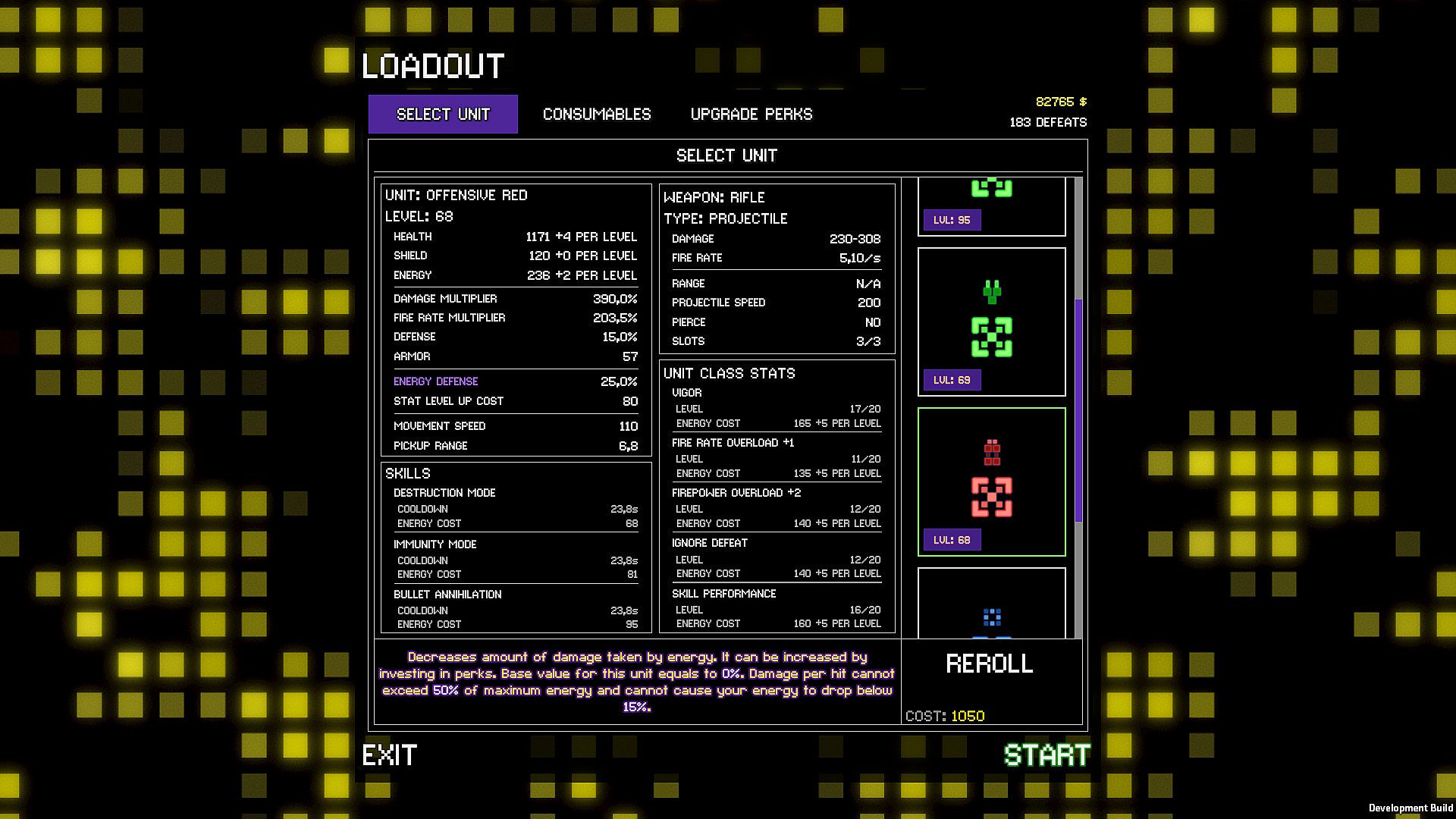• During the run you beat wave after wave by defeating enemies and achieving scores which depend on amount of enemies defeated and amount of damage taken during the wave. Defeated enemies drop power ups: healing, energy and currency. Healing restores your unit's health points. Energy is used to level up your unit's stats (which are not permanent, once you are defeated they are gone!) or use skills. Each unit has 3 different skills which should be used strategically to survive as long as possible. Currency collected persists through defeat and is used in loadout.
