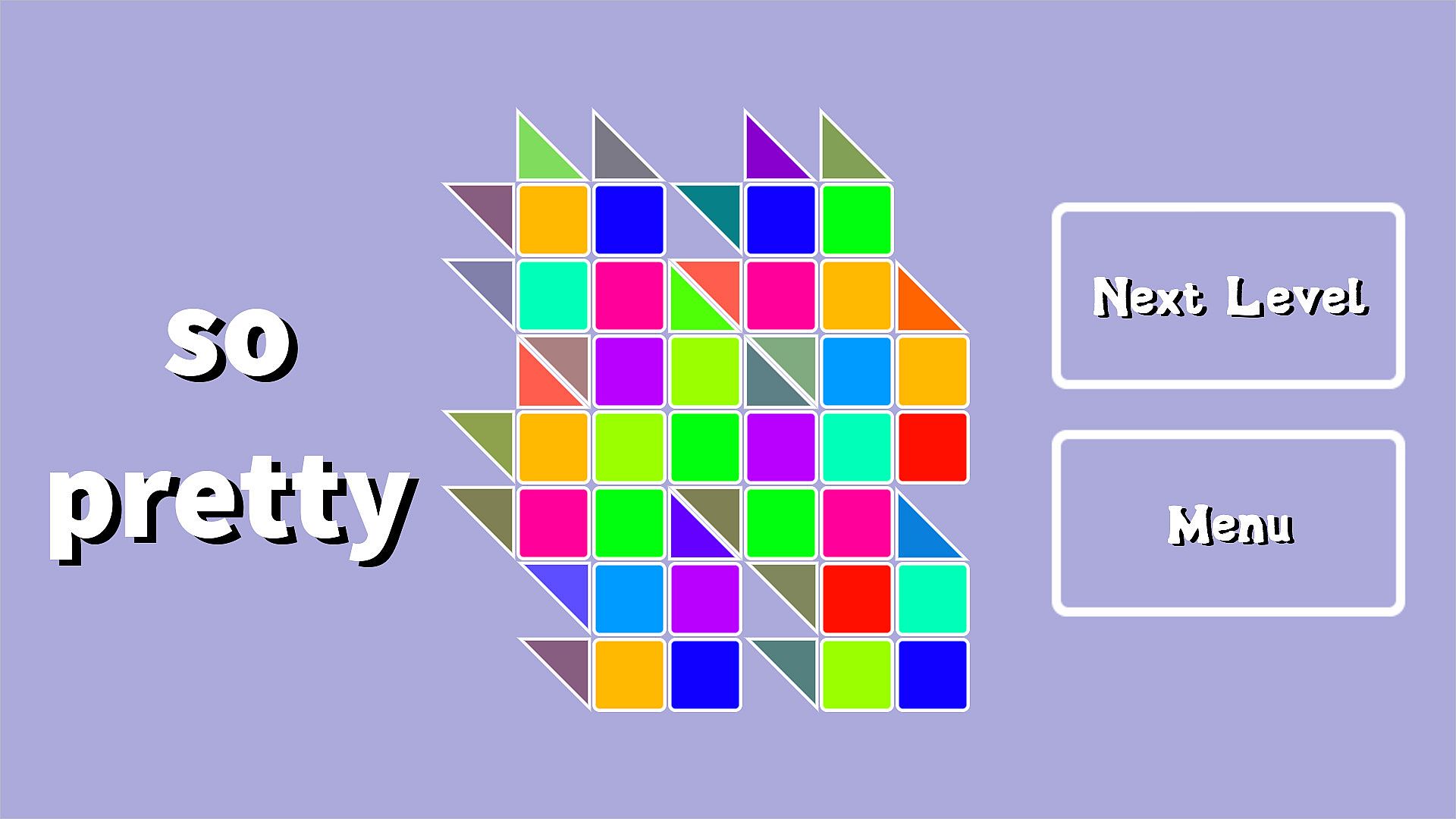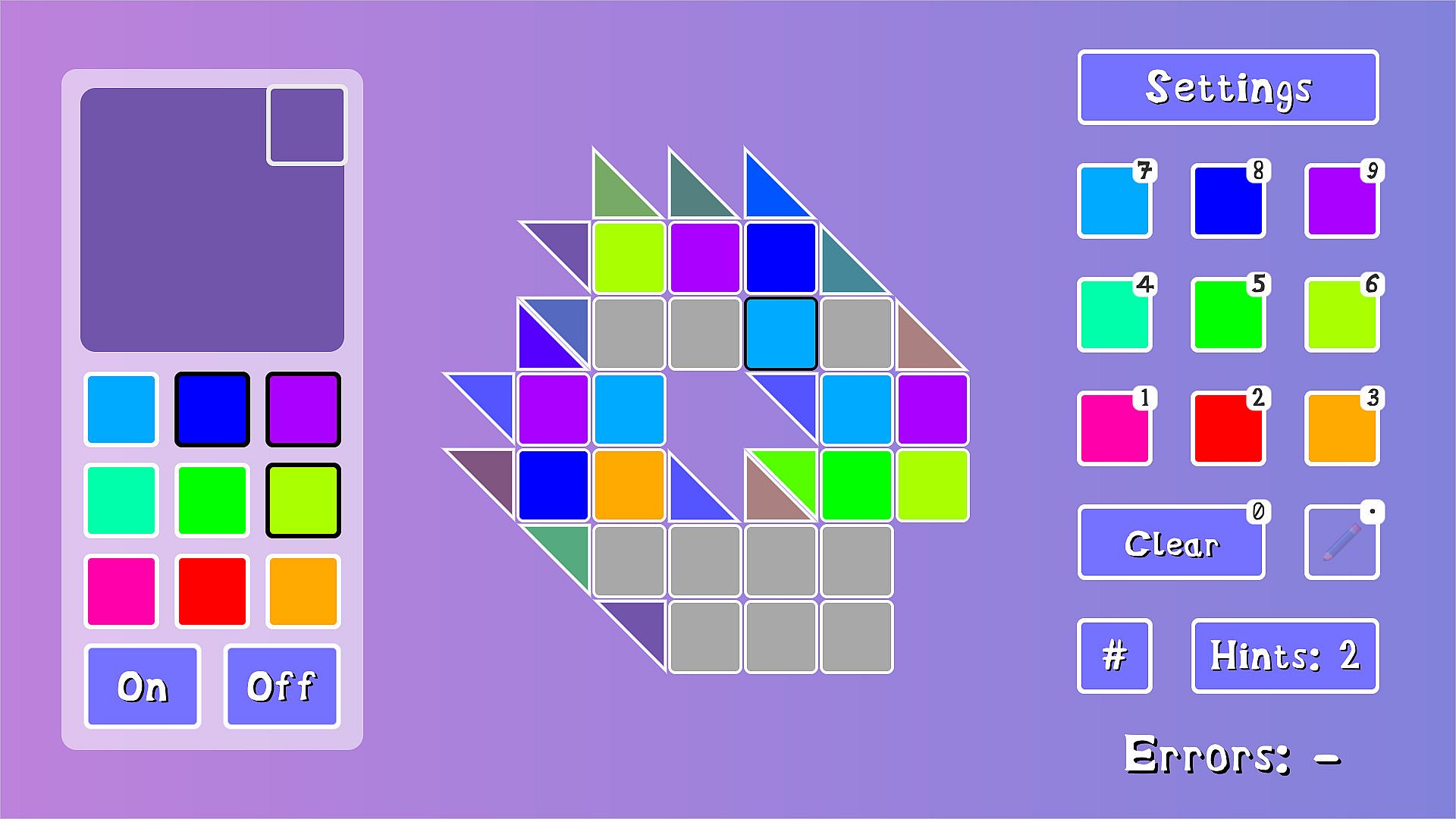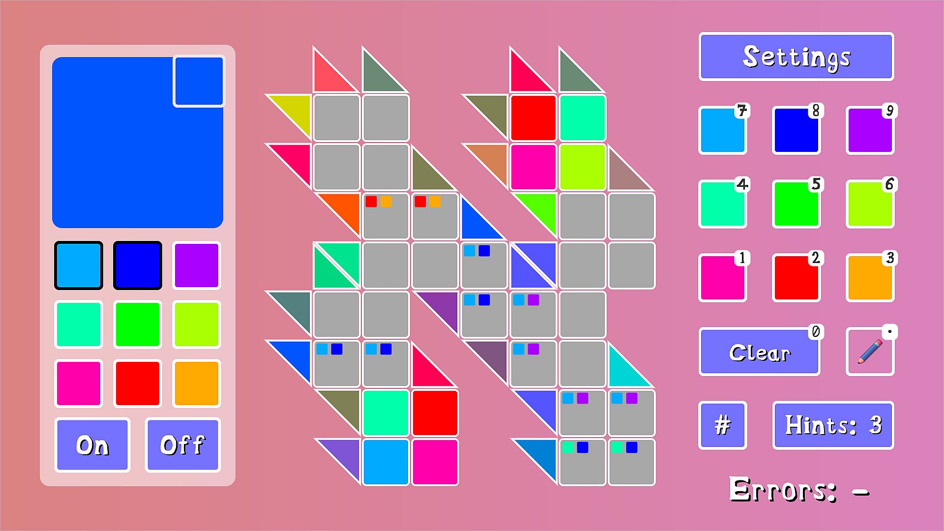 The triangles are the color clues the player uses to figure out which colors to place into the empty squares. Each grid square is a part of a vertical and horizontal clue. The color selection area has nine colors which are equidistant from each other on the RGB color wheel. This is so mixing colors didn't result in a lot of browns and greys. Also important to notice how the greens look kind of similar. In a lot of levels, the greens are almost indistinguishable from each other, but the way they mix with other colors are very different. This area also contains a lot of helpful tools that will make sure no player gets stuck on a level.