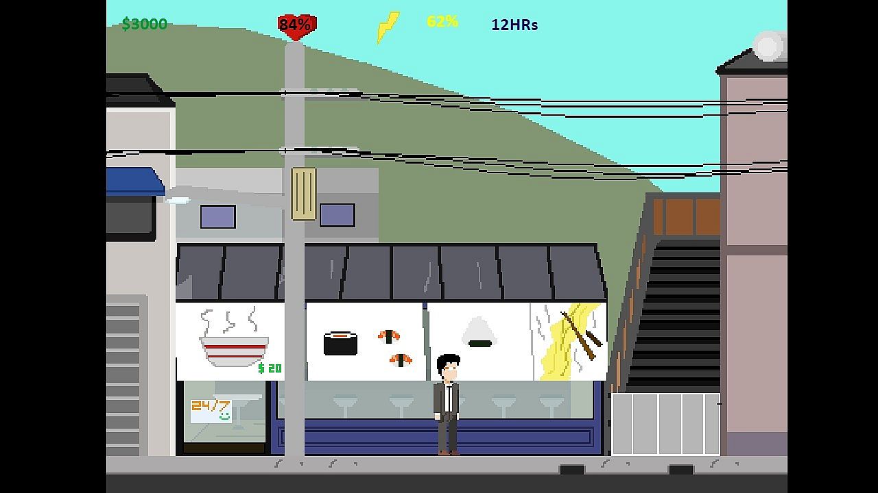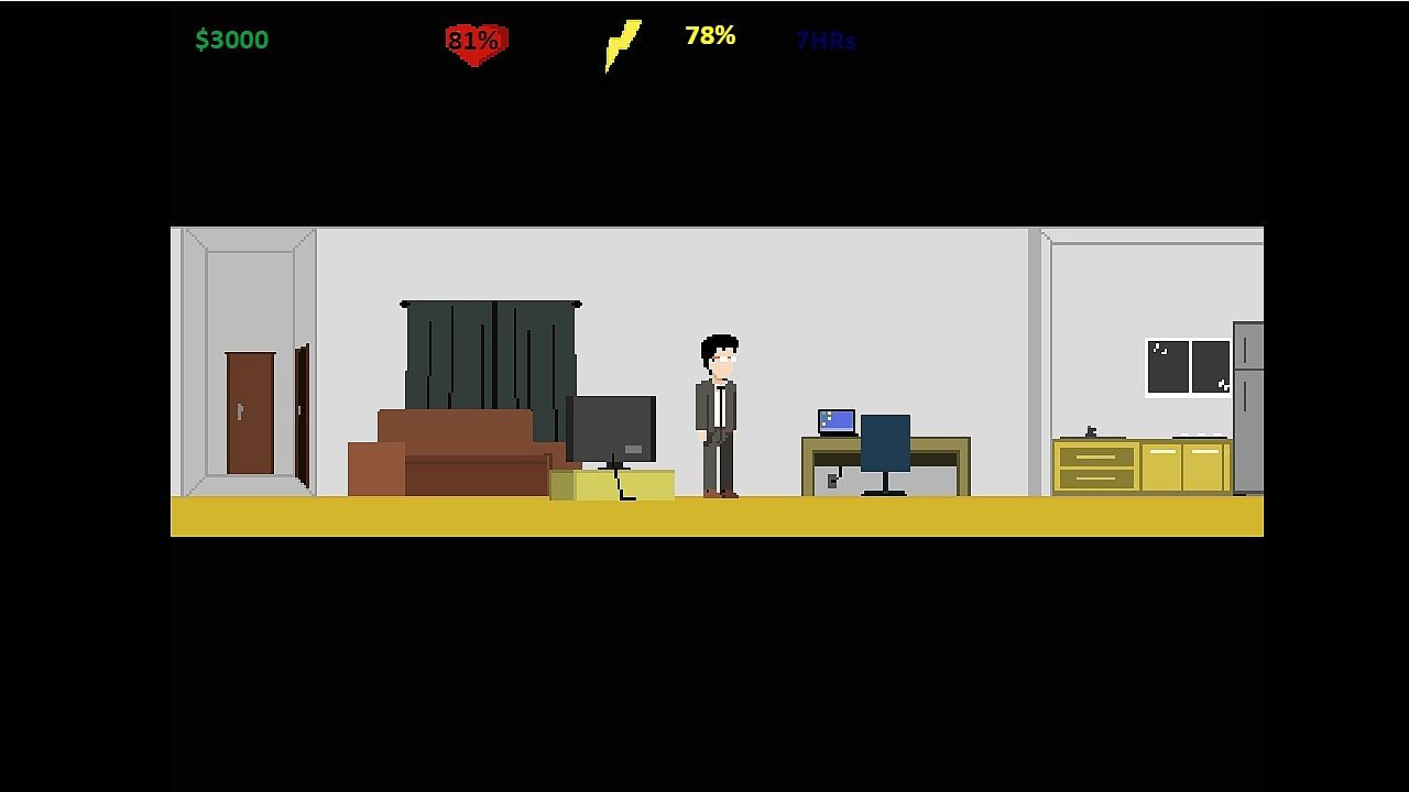 Kyo's Routine is a routine simulator , in this game you will control Kyo and work every day living a boring routine, but all this is for a good cause, it’s to save your girlfriend Mari, who is in hospital. You can start on a job, and get promoted to earn more money, and invest to earn even more. Don't forget to take care of yourself, buy food, sleep regularly, and avoid drinking too much energy drink. Your goal is to get 20,000 to pay for Mari's surgery ,and look for a certain someone who is selling a wedding ring. In addition to conventional work, there are other ways to make money, such as fishing, deep sea fishing and also making money playing video games.