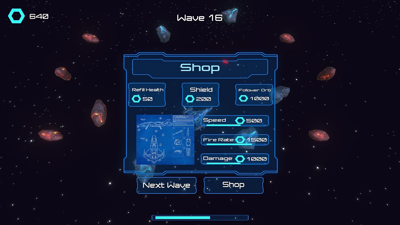 • A shop with 3 different items and 3 different spaceship upgrades with 5 upgrade levels each!