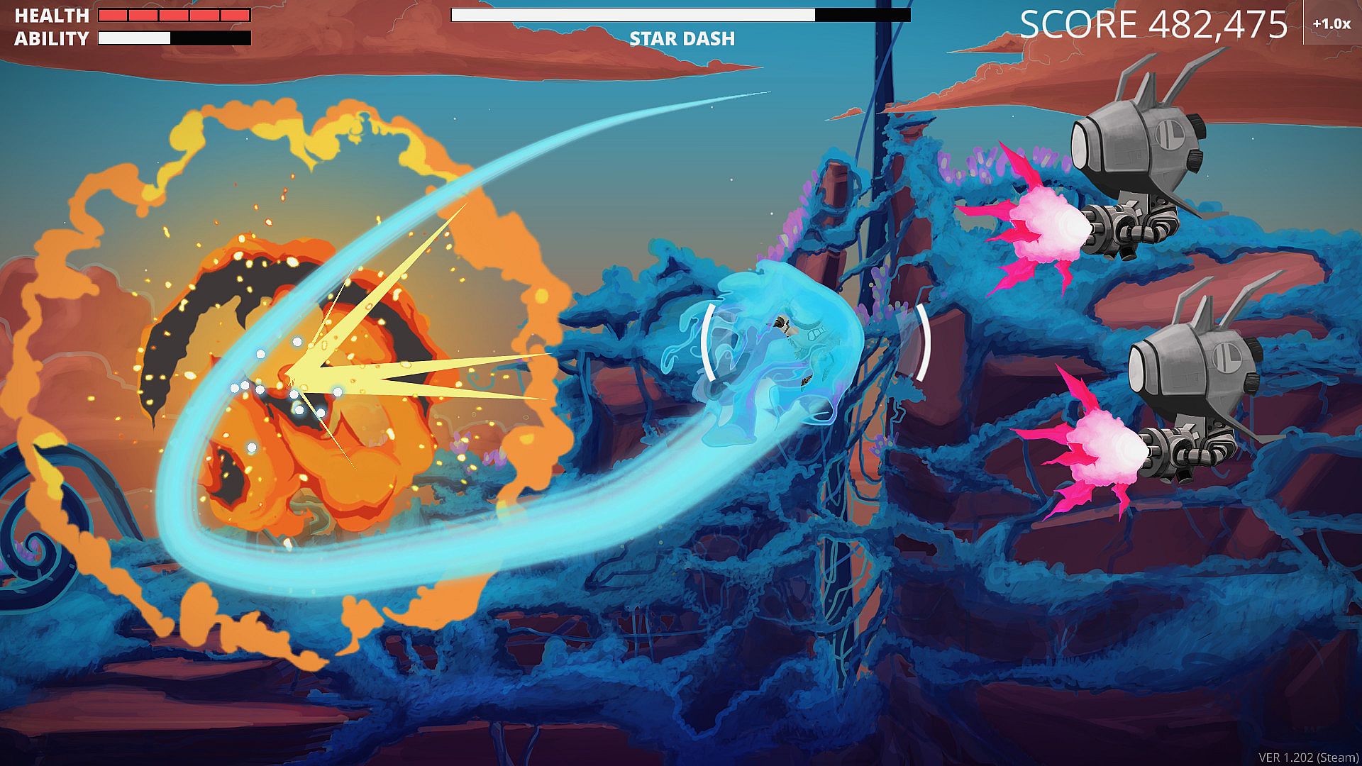 Using a one-handed, mouse-driven control scheme, you'll dodge and strike with 1:1 precision and unlimited movement speed. Evade intense bullet patterns in the blink of an eye, then dash through entire enemy squads to crush them in a single gesture. Movement is everything in Legacy of the Elder Star, and no other shoot 'em up moves like this.