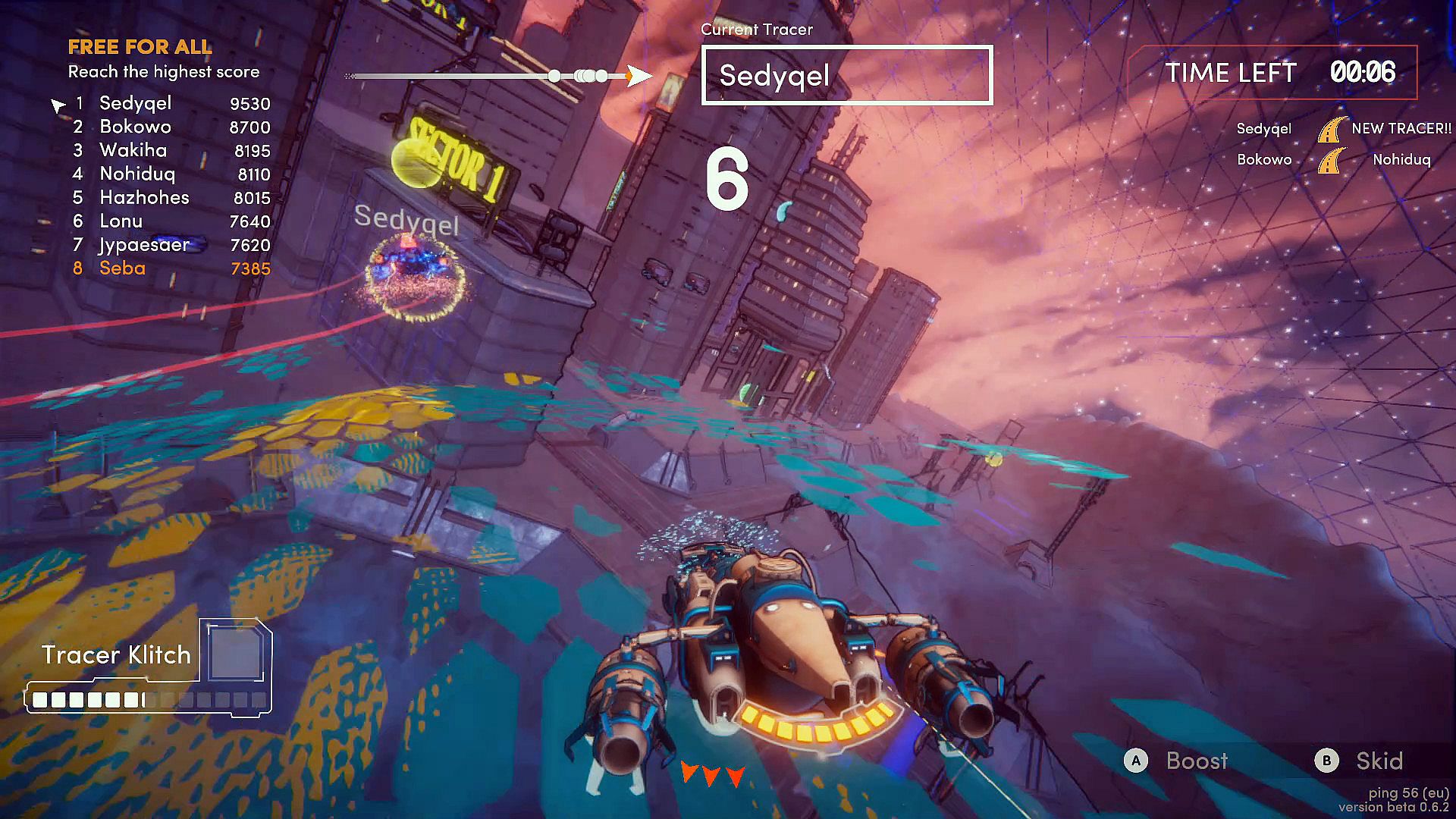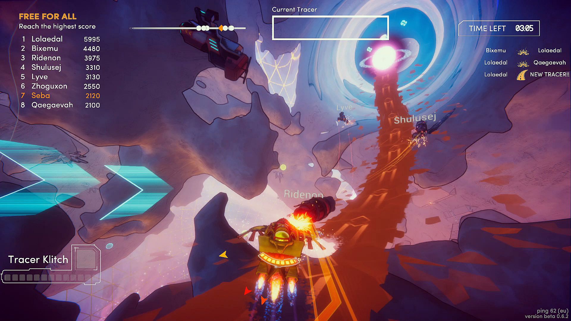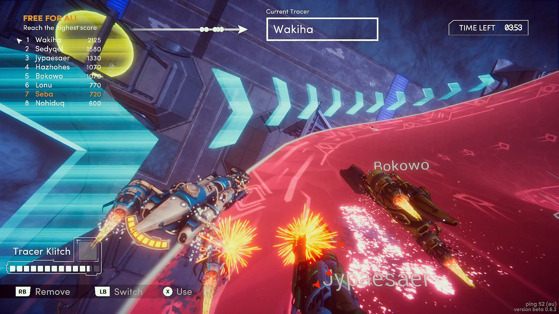 The leader of the pack is called the Tracer. He's the one drawing the road, free-roaming through the battle arena in space. By making the road treacherous, those chasing him will fall off. This will earn the Tracer points. At the same time, the Chasers are fighting each other in an effort to claim the first spot. By using all kinds of power-ups, Chasers can earn points by bumping each other off the road.