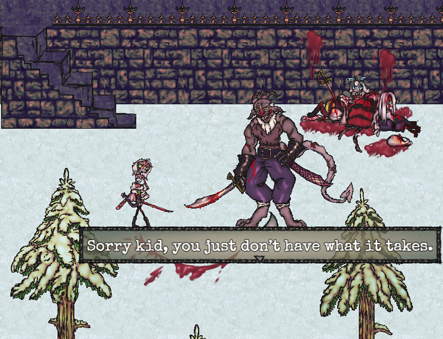 A wicked girl-adventure RPG, with the elements of exploration, 2D action combat, and puzzles, developed in RPG Maker.In this game, you play as a tomboy maid, runaway from her captor and master, who dreams of exploring the world, becoming a famous warrior princess and finding many riches - but the evil nature that runs in your devilry blood, the razor-sharp teeth and striking white hair, make you an enemy of many and a friend to few.