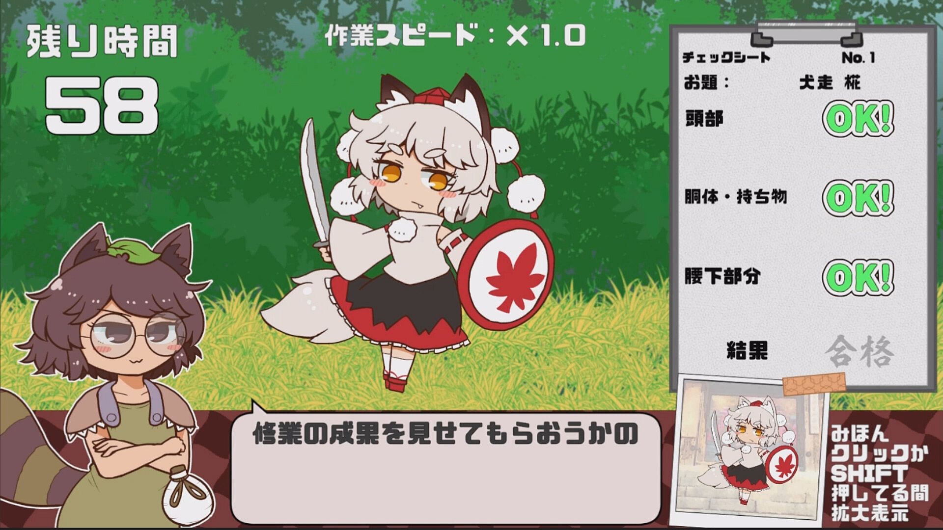 Spot differences in raccoon dogs under Mamizou Futatsuiwa's command in this speedy indie simulation game. Players inspect head, upper waist, and lower waist sections against a sample, marking correct parts as OK and errors as NG. Mistakes include color shifts, missing decorations, altered belongings, or entirely swapped elements from familiar Touhou characters. Answer three questions correctly in a row to ramp up game speed and check more raccoon dogs as stages progress. New characters unlock with advancement, rewarding those who recognize them quickly without full comparisons. This fast-paced mistake-finding challenge suits Touhou fans who thrive on quick visual checks and chain accuracy.