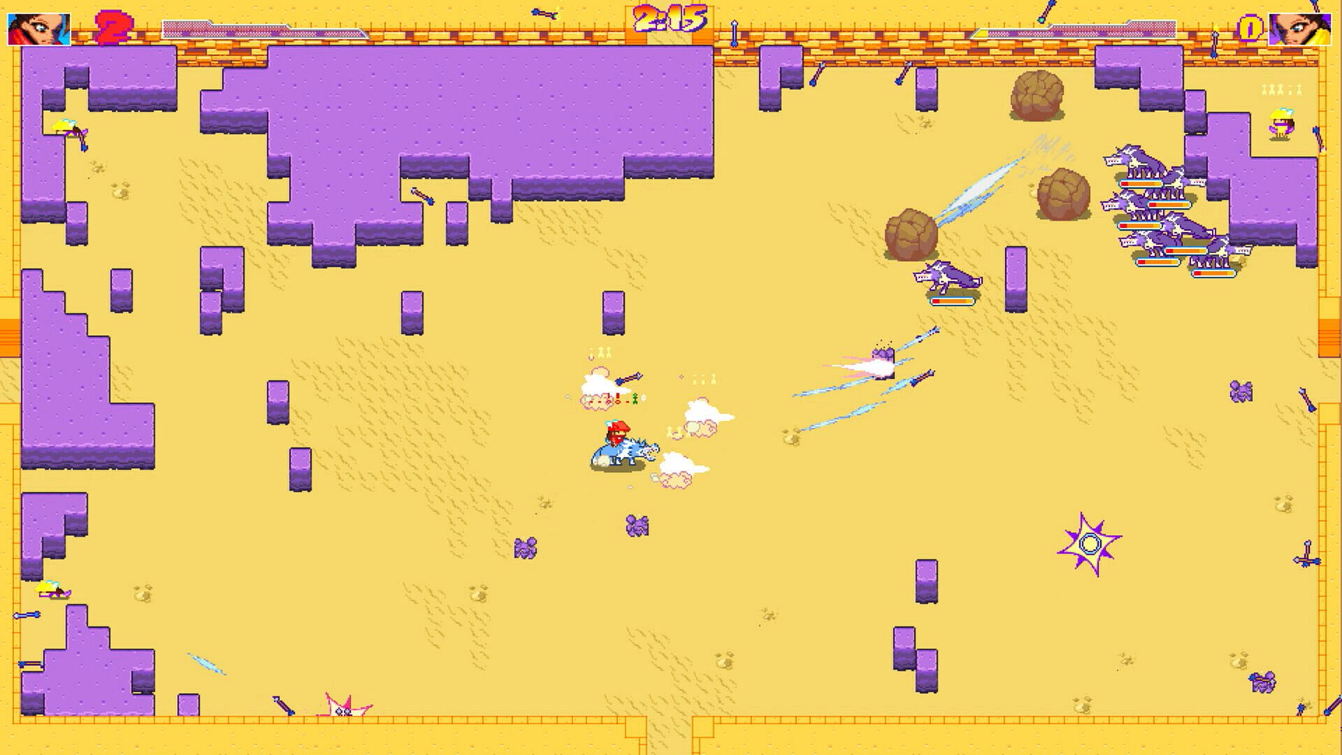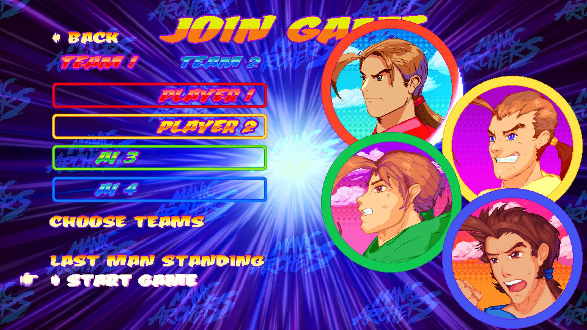 In versus-mode players each control an archer, shooting the opposing archers until only one archer is left - besides Free-For-All versus, Manic Archers is featuring several other well known multiplayer modes.