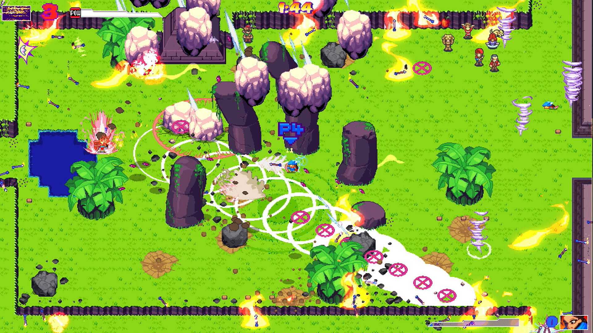 Manic Archers - Bullseye DEMO delivers a free taste of ultimate local multiplayer retro arcade action on PC. Players control archers in top-down versus matches, using jump, shoot, and dash/block controls on a single screen with wrap-around scrolling. Powerups, special arrows, and interactive maps with water, obstacles, switches, explosives, and burnable trees add strategic depth to modes like Free-For-All, King of the Hill, Catch the Fool with the Chicken, Conquer, and Survival Coop. This indie casual game supports up to four players locally or online via Remote Play Together, with AI opponents for practice or solo training. Special moves include super dash during jump descent, stomp jump in mid-air, and shield by holding dash. It suits fans of fast-paced, easy-to-learn multiplayer chaos with deep mechanics.