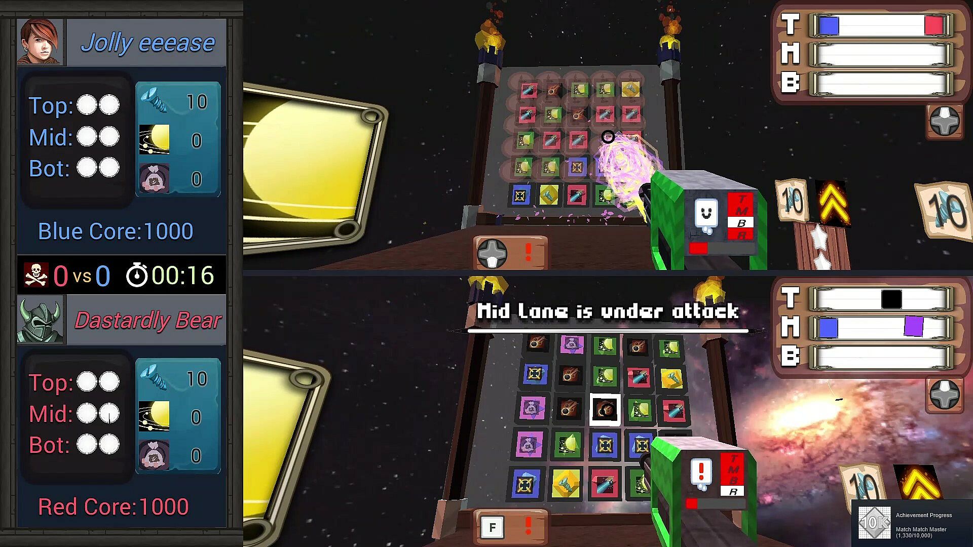 Match Match Mania! fuses match-3 puzzles with tower defense in a competitive indie sports showdown on PC. Players destroy or swap gems to form matches, including massive Mega Matches of nine, and send minions down lanes like Top, Bottom, Mid, or Jungle to assault enemy towers. An RTS-inspired economy lets you hire peons to mine bolts, research upgrades, and buy powerful items in real time while sniping foes with keyboard-and-mouse or controller precision. Split-screen play pits friends head-to-head, with Steam Remote Play for remote battles, and Gem Frenzy Mode strips away towers and items for a pure race to match fastest. Action strategy fans who crave adaptive, real-time decisions against human opponents will find their perfect arena.