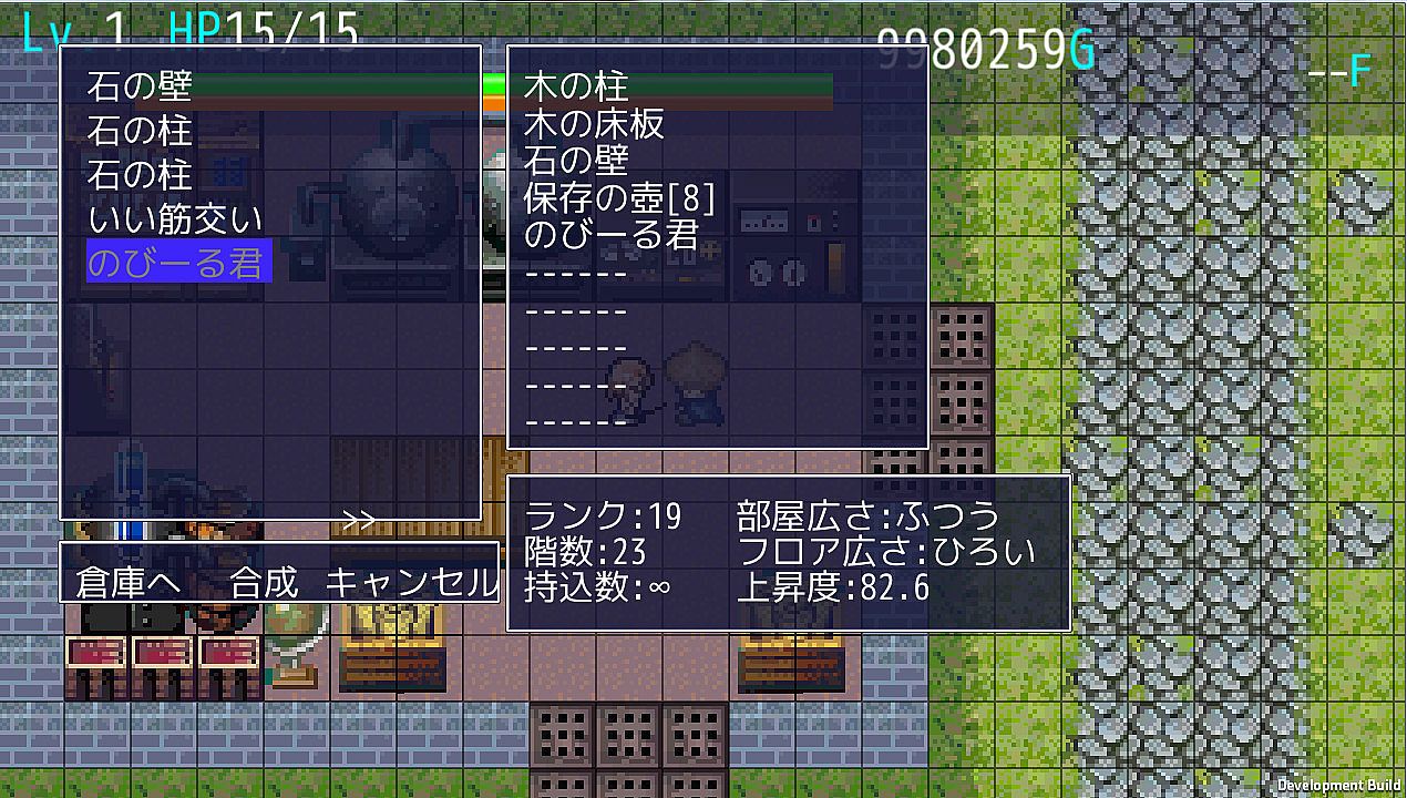 ダンジョンにはときどき柱や床やその他諸々の素材が落ちている。この素材をダンジョン合成機に投入することでダンジョンが合成されるぞ!使う素材によって、フロアが広くなったり、部屋が多くなったり、罠が増えたり、アイテムが出やすくなったりするぞ!はじめのうちは一度に使える素材の数が少ないが、冒険していくくなかでダンジョン合成機をグレードアップさせることでき、その数を増すことができるぞ!