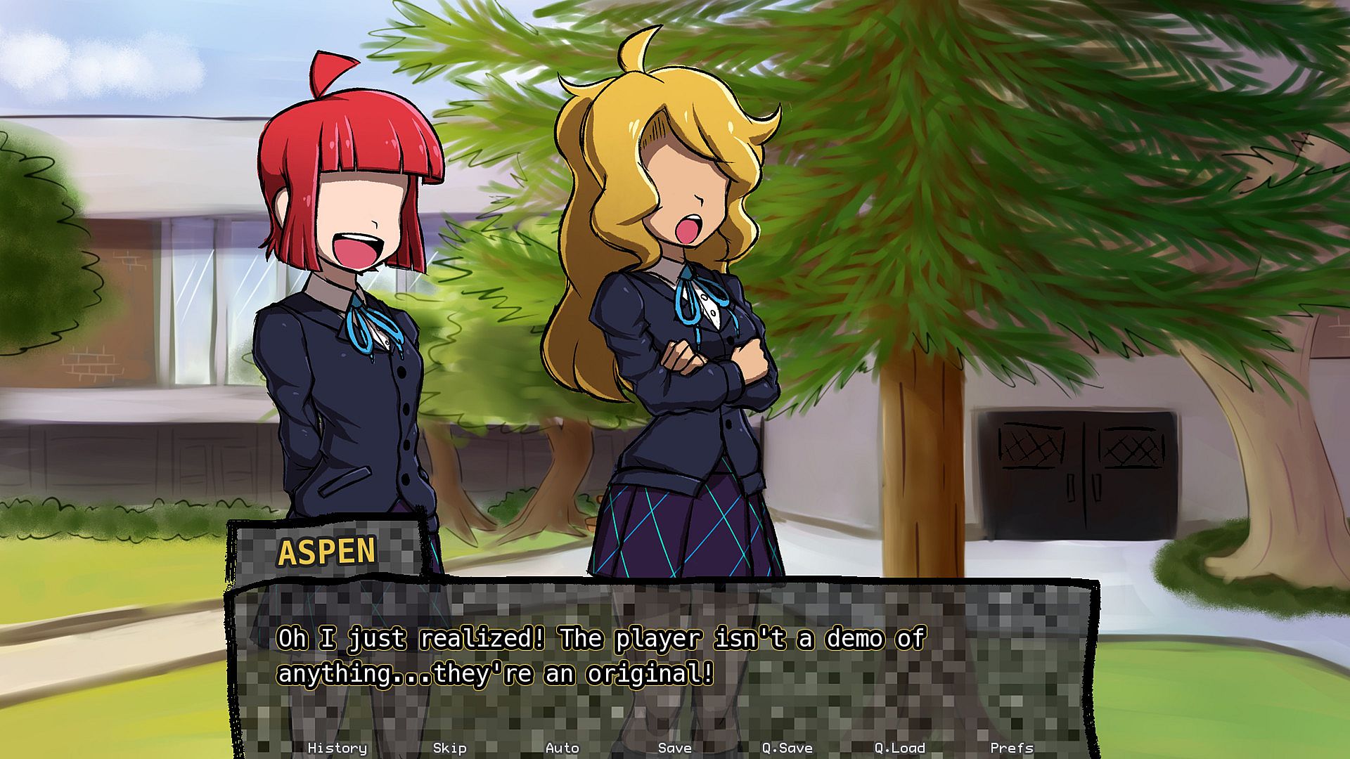 ASPEN: Hey YOU! Yeah, YOU! Wanna chat it up with some cute girls? (And a super cute non-binary person?) Then you've definitely found the right game! We're not like those other inferior dating simulators. We have the advantage of knowing who, how, why, and what we truly are! Well, uh...mostly. That's where you come in! You can be the one to tell us once and for all what we're really doing here! And with the help of your good buddy Aspen, we'll ensure that this game gets its best ending! Our fate rests upon your shoulders, O wise player!