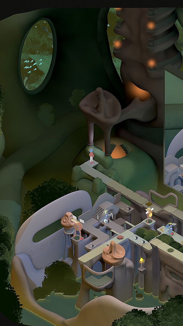 Living creatures near the LUMEN gradually evolve into humans. They learn the methods of mining and using the LIGHT. They pipe the LIGHT to high places, illuminating most places. Technology and civilization are developing. Kingdom has formed.